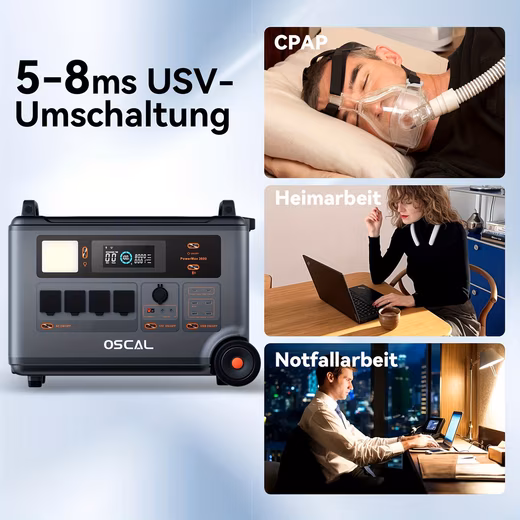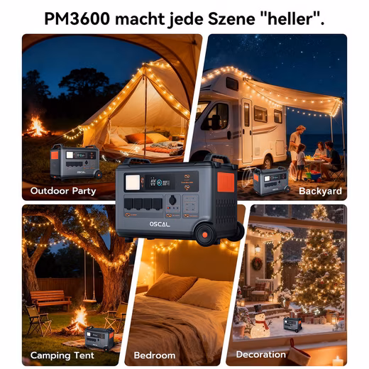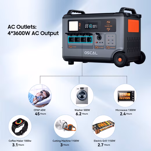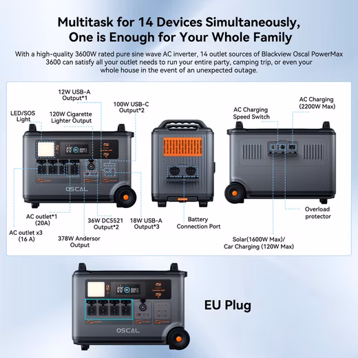 With a capacity of 3600 Wh, a power of 3000 W, 4 AC outputs, 4 USB-A and 2 USB-C outputs (100 W), the OSCAL Powermax 3600 effortlessly powers all devices.