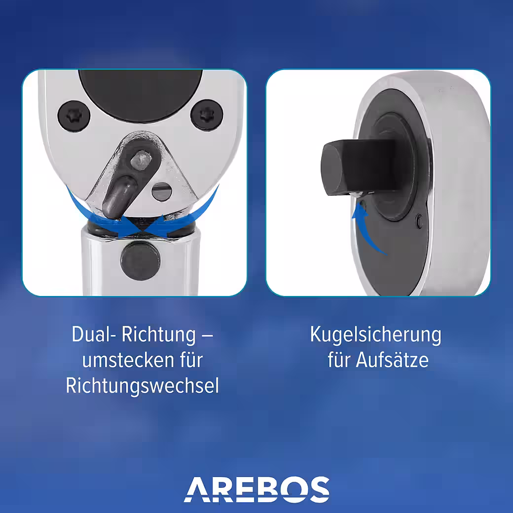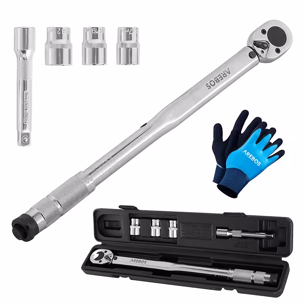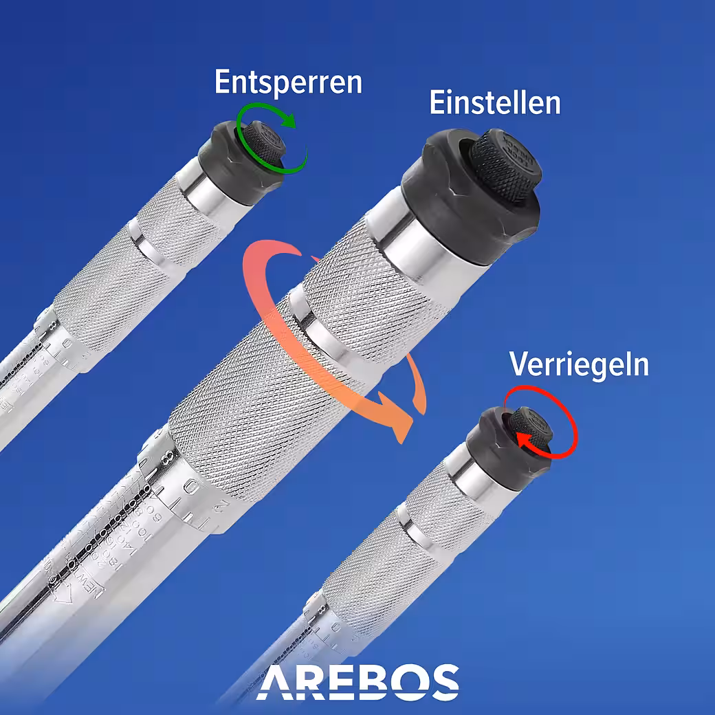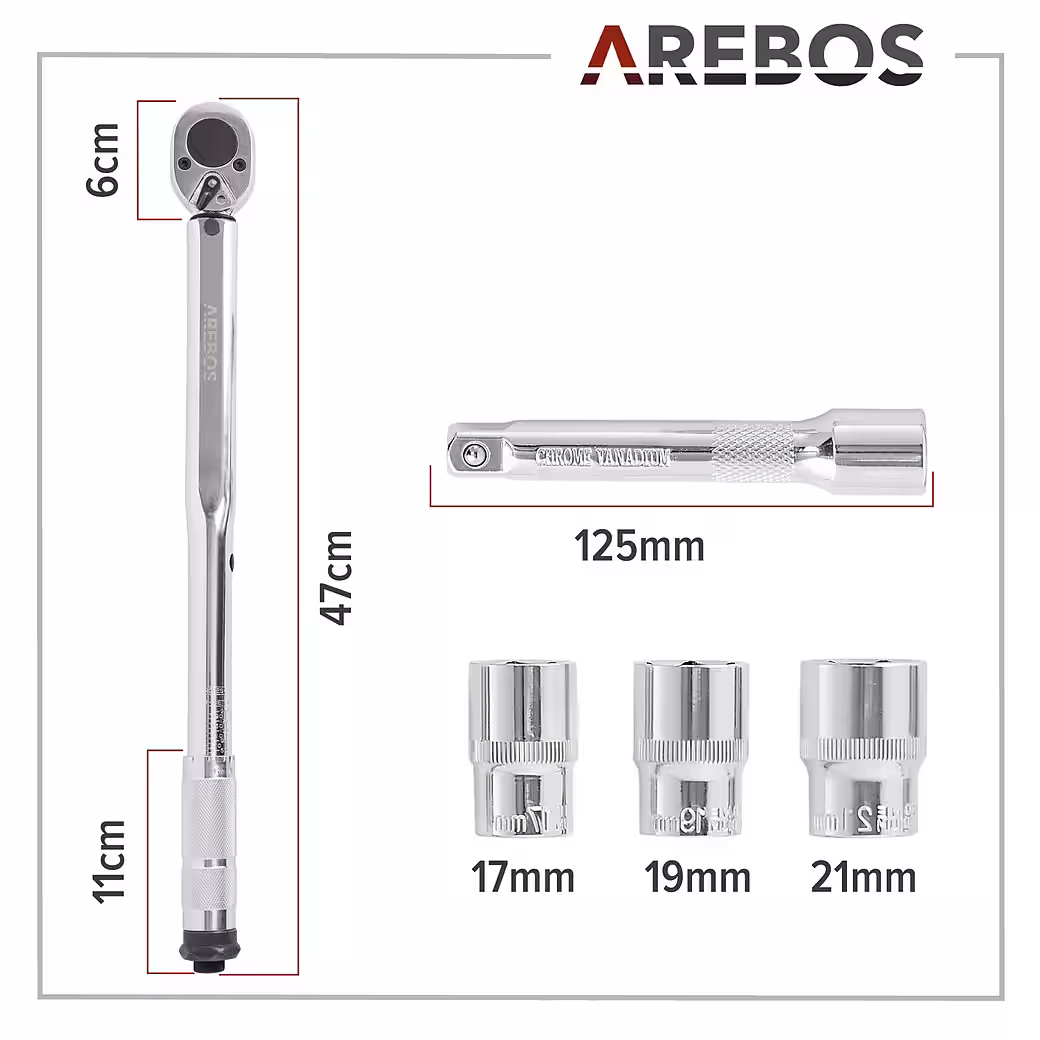 The AREBOS 6-piece torque wrench set provides everything you need for precise repair work. It offers simple and safe operation, a signal indicator when the pre-selected torque is reached, and a double-sided reading scale.