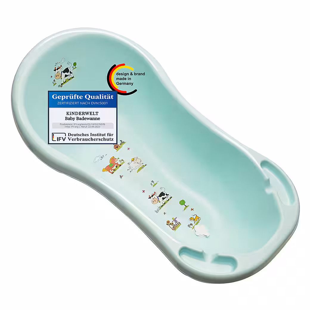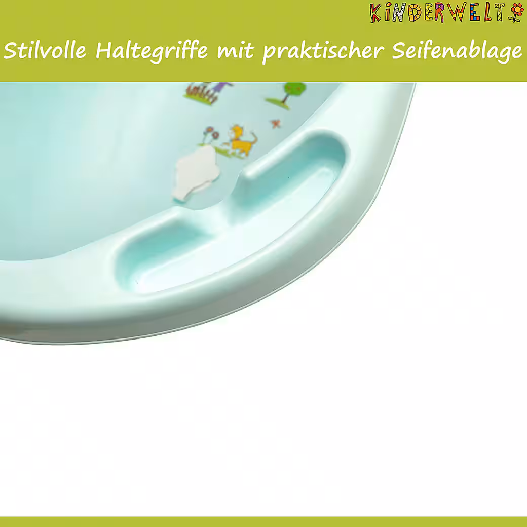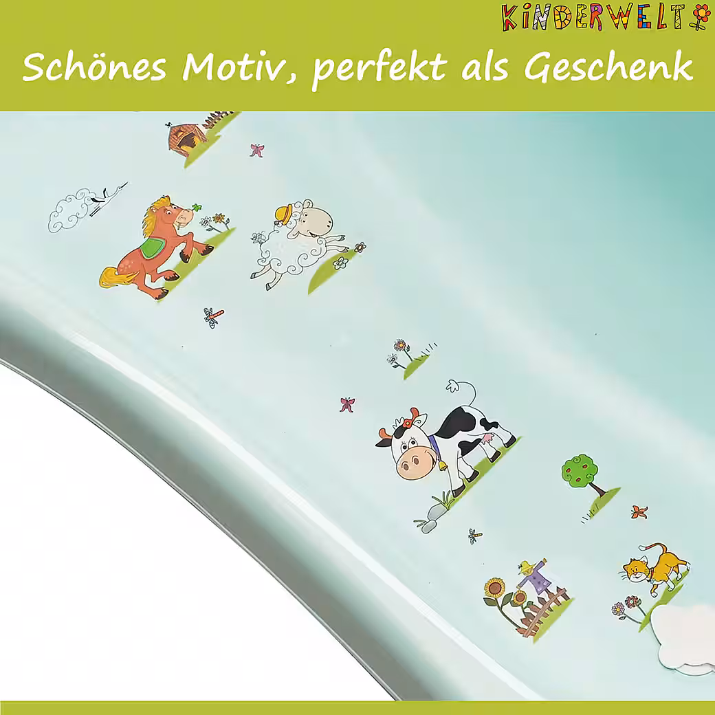 High-quality, durable plastic (PP/TPE), BPA-free and phthalate-free, made in Europe. Popular Funny Farm design in aquamarine, scratch-resistant decoration, easy to clean, dimensions (L x W x H): 100 x 51 x 29 cm, weight: 1200 g.