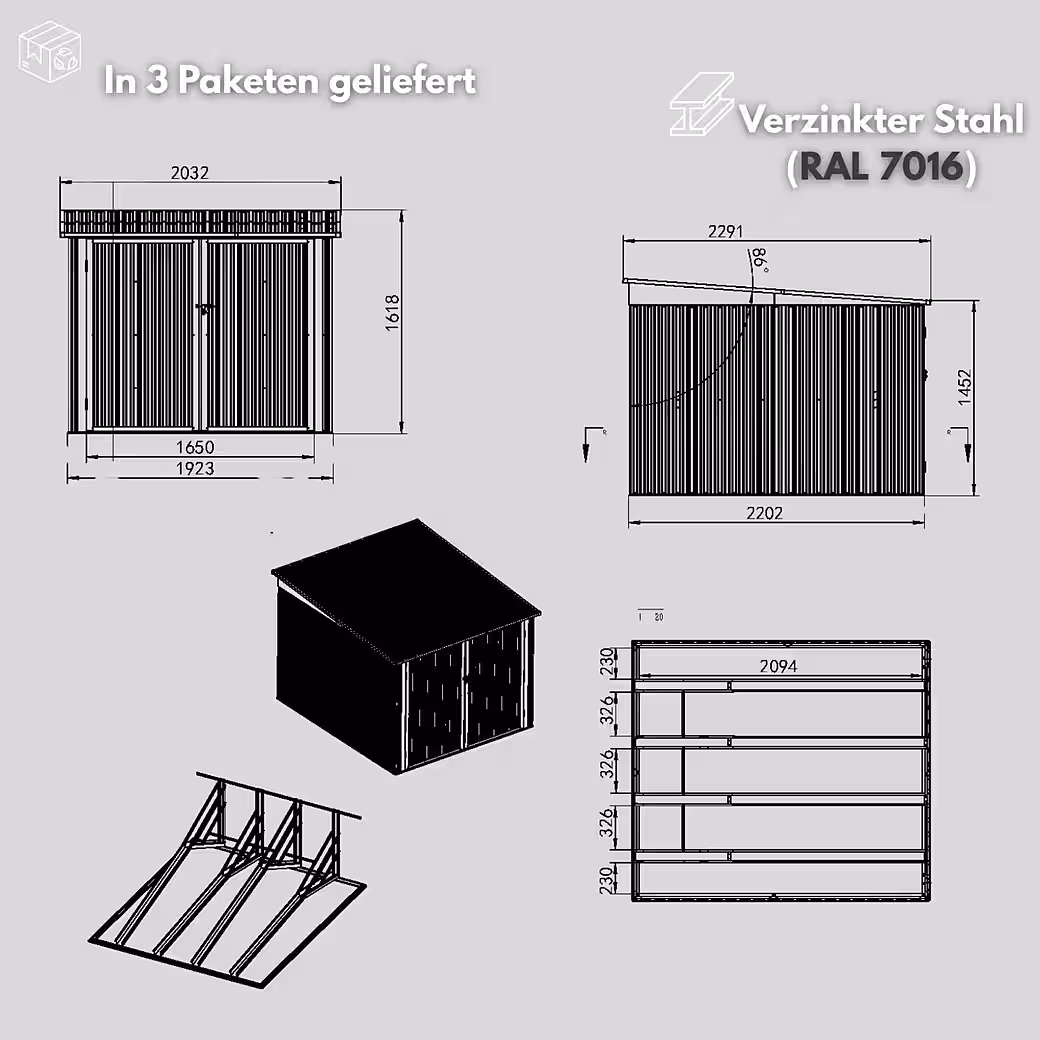 - TECHNICAL DATA: Dimensions (203cm width, 229cm depth, 162cm height), galvanized and painted steel (RAL7016) is used, edge protection is fitted, normal door.