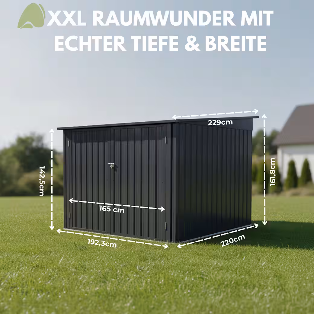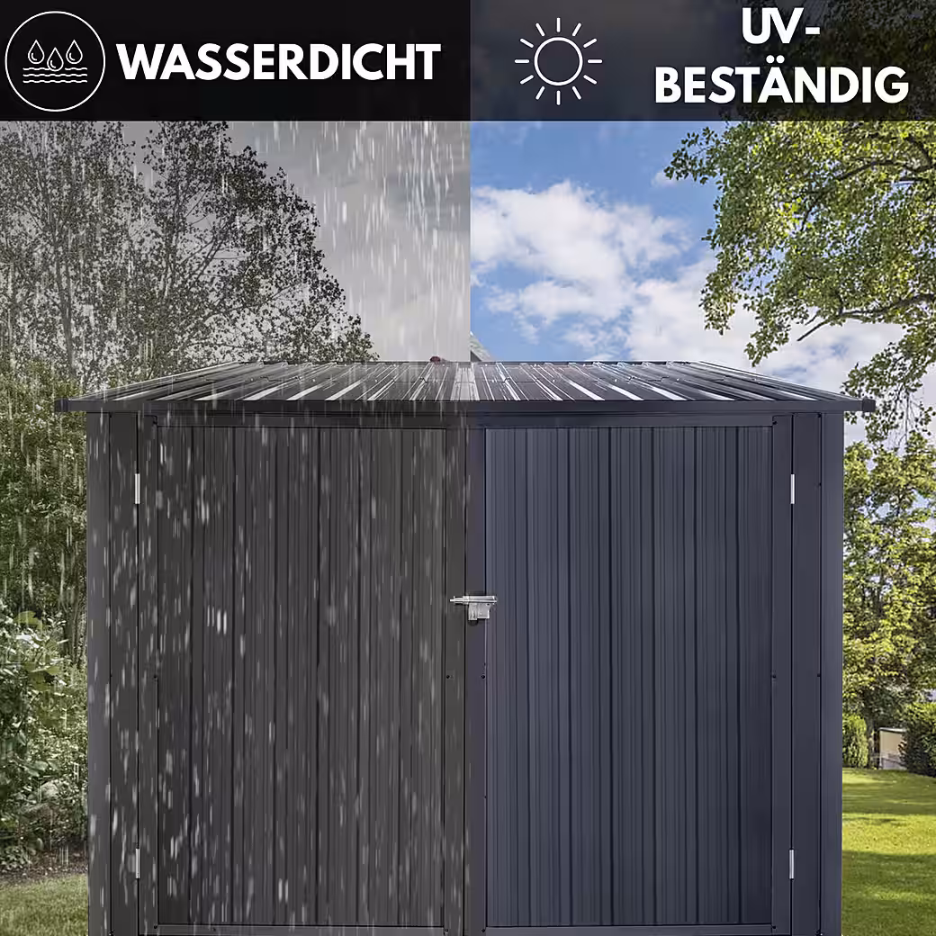 - WEATHERPROOF AND DURABLE: The galvanized steel and the anthracite-colored paintwork offer the garden shed reliable protection against weather conditions such as rain and UV radiation.