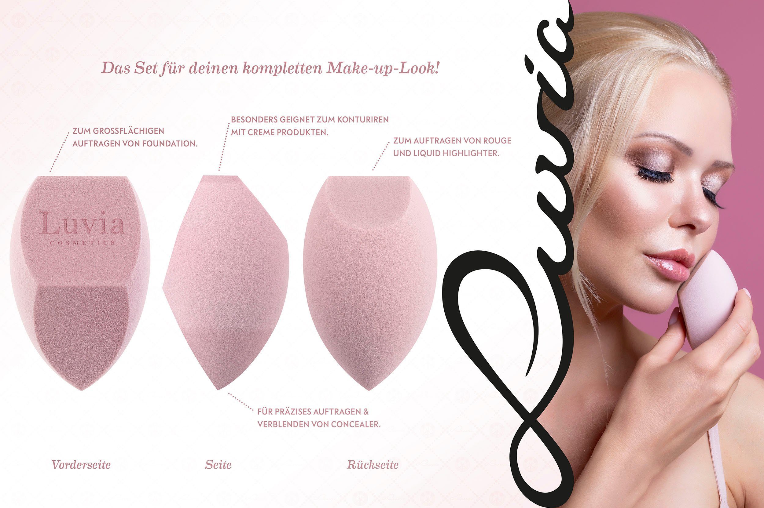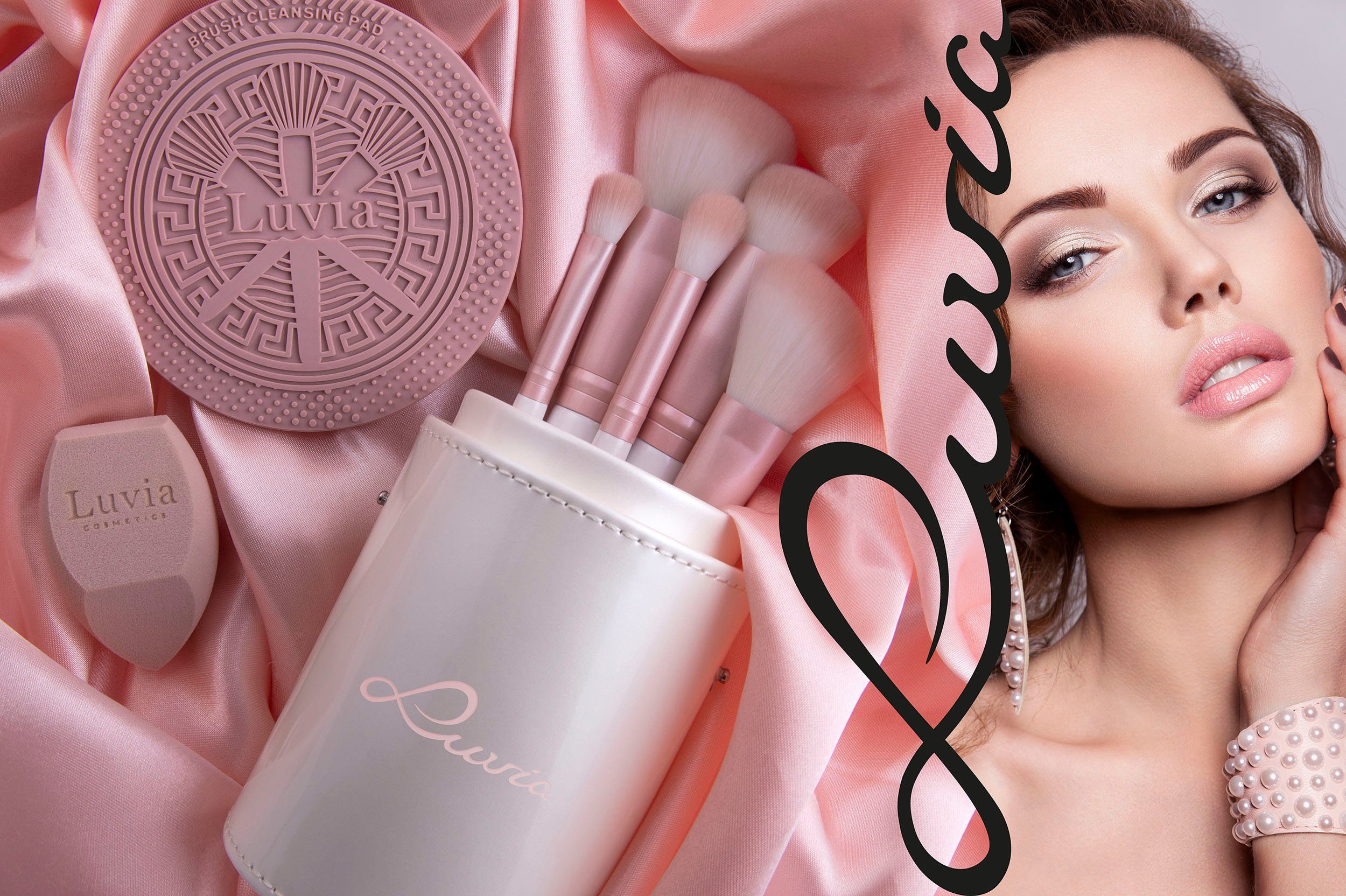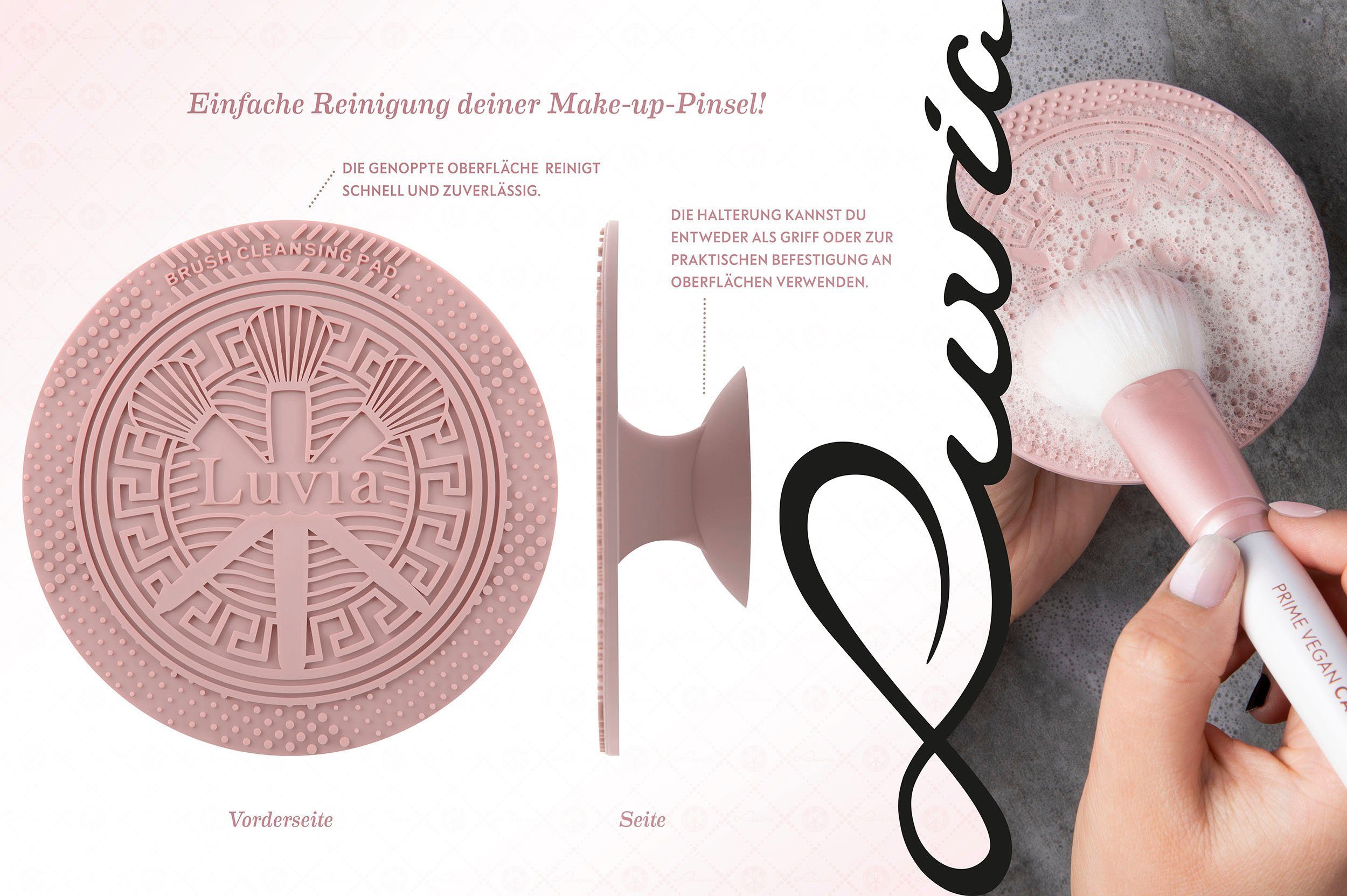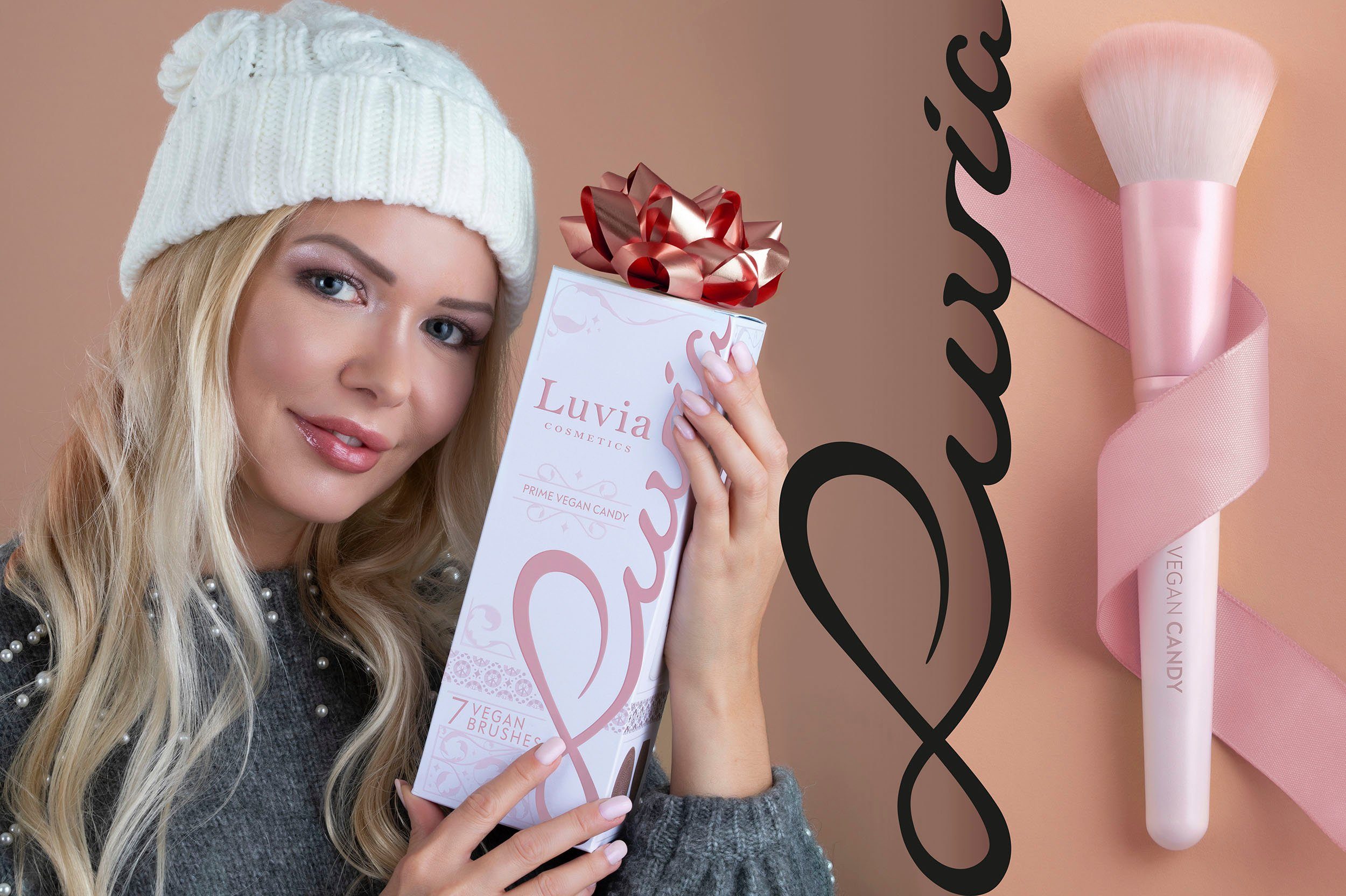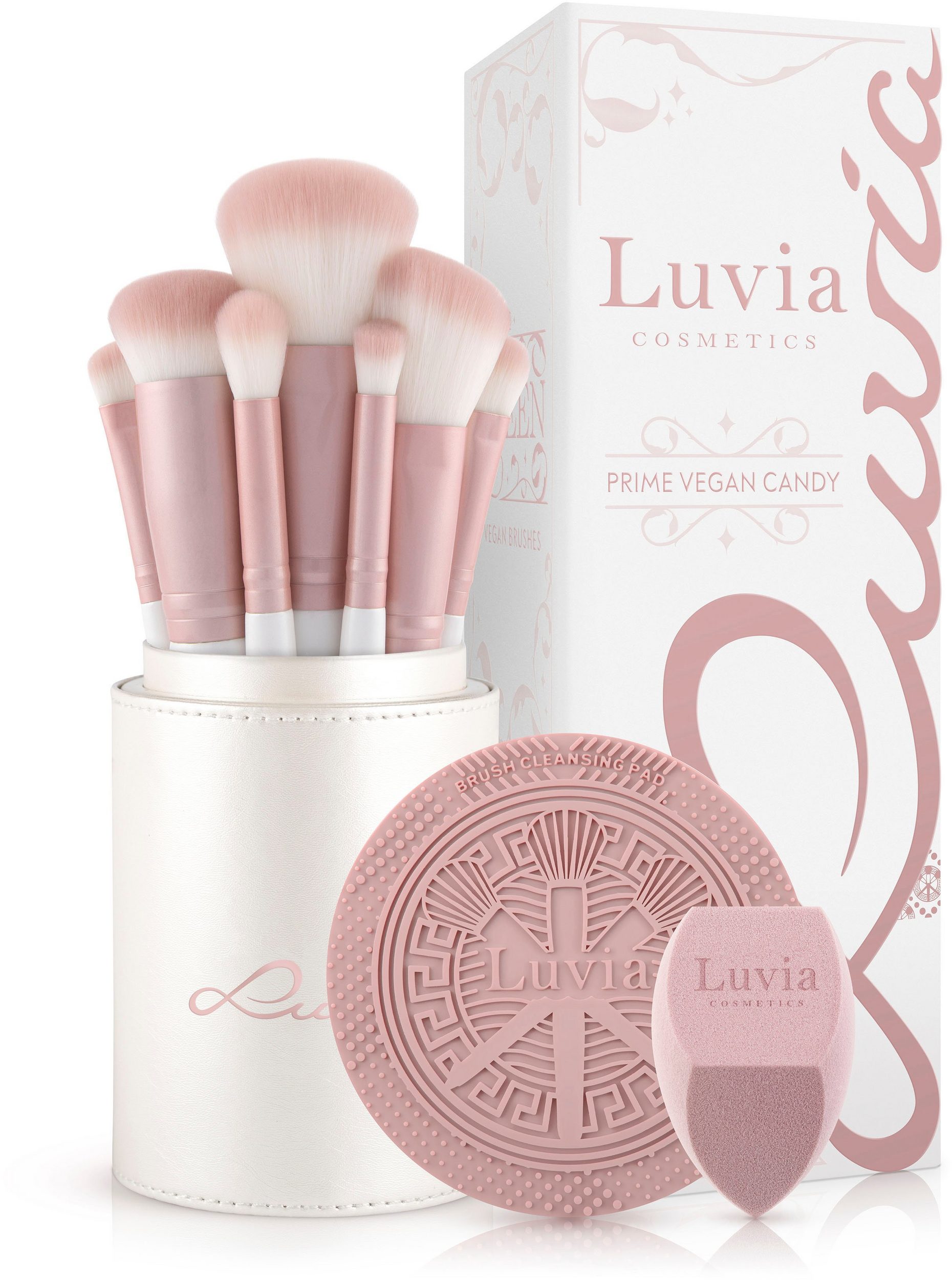 The sweet Prime Vegan Candy Set will make every beauty lover’s heart beat faster! Seven handcrafted cosmetic brushes and a fine-pored sponge blend any makeup quickly and flawlessly. At the same time, they pamper the skin with their soft Nurai bristles. This vegan brush bristles optimally absorb foundation, powder, and other makeup products and apply them precisely and evenly – for an even complexion and a radiantly beautiful makeup look. The brush case stylishly stores the brushes and is a real eye-catcher! Shiny candy pink ferrules and handy pearl white handles complete the elegant design. The exclusive cleaning pad ensures hygienic brush cleaning.