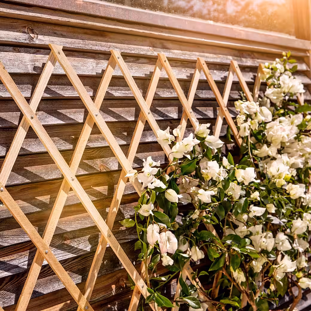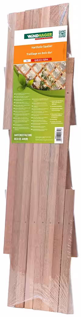 Ideal for mounting on house walls, this trellis provides support for roses and other climbing plants. Available in various sizes, all extendable for adjustable width. The trellis consists of untreated wooden slats, 23 mm wide and 6 mm deep, made from particularly weather-resistant wood.
