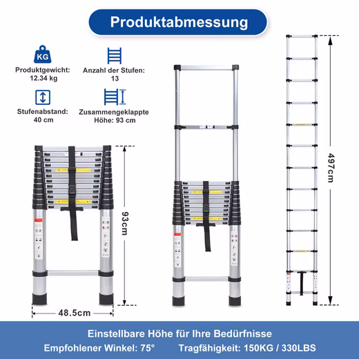 Portable and flexible: The telescopic ladder is made of a lightweight yet high-quality aluminum alloy and weighs only 12 kg. When folded, the extension ladder is only 0.93 m high. It can be stored in the basement, attic, or storage room to save space and facilitate transport.