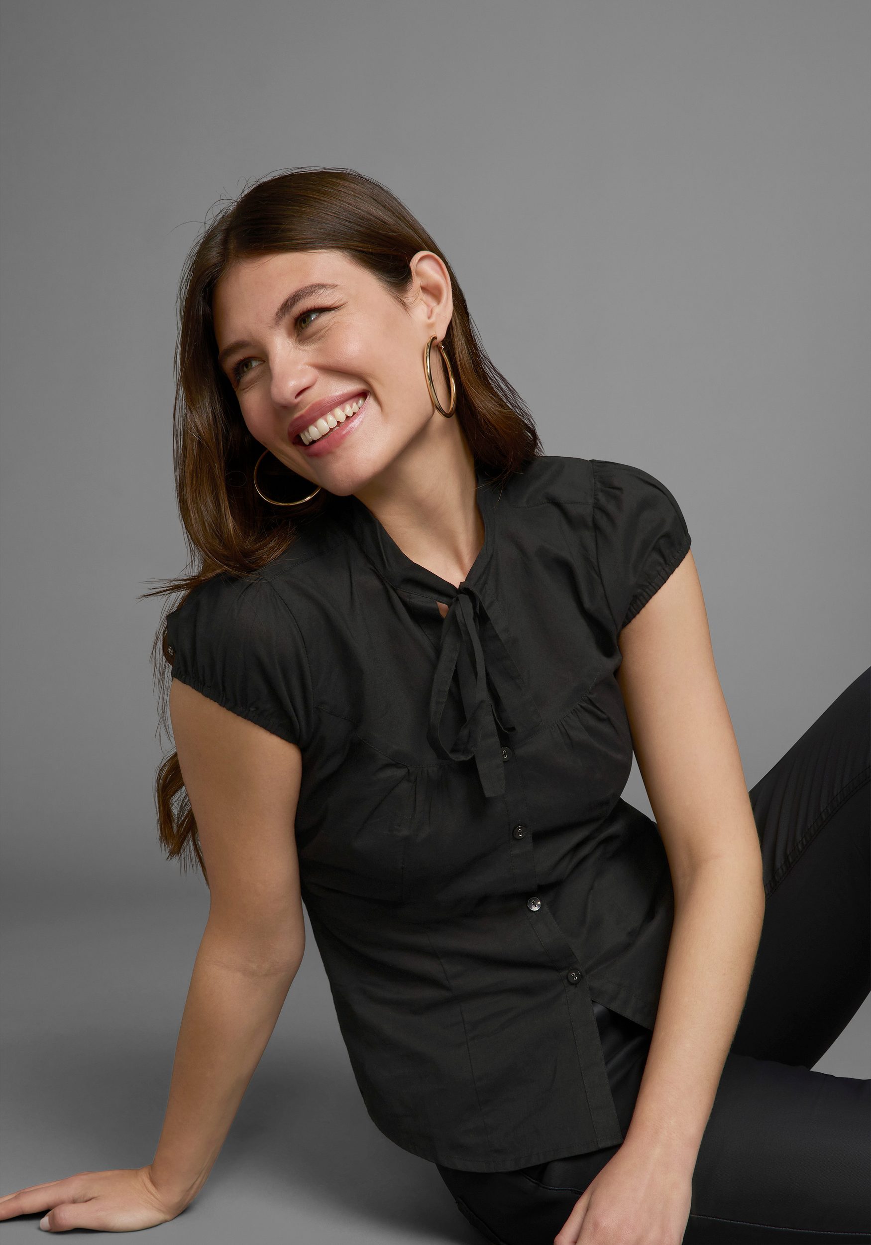- Short gathered sleeves add the finishing touch to this blouse