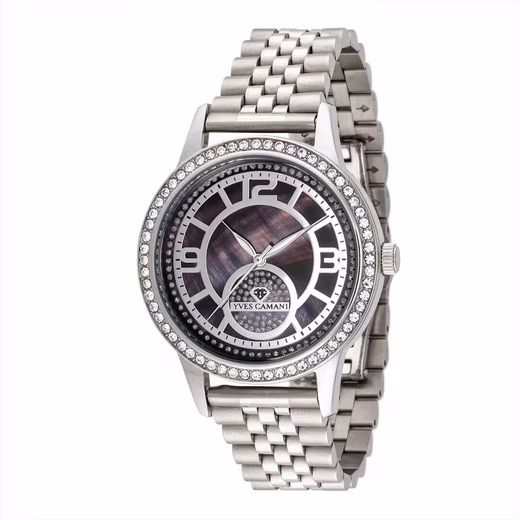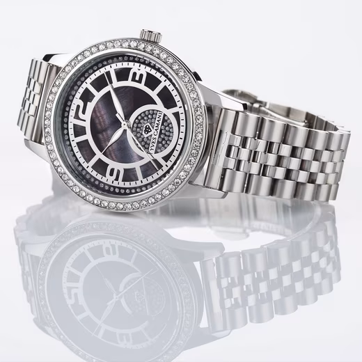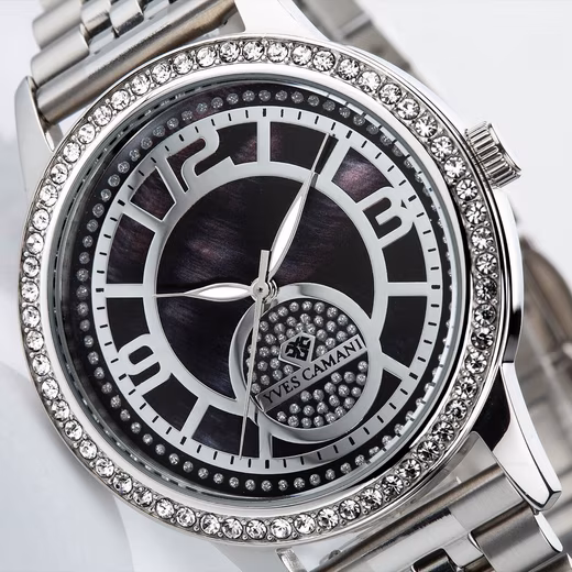 The distinctive ROUEN ladies’ watch captivates with its combination of high-quality materials and playful elements. The strikingly designed dial is uncluttered yet luxurious: two rings of sparkling crystals of varying sizes glamorously frame the mother-of-pearl dial with its crystal surface. At the heart of the watch beats a precision Miyota movement. The robust stainless steel case combined with scratch-resistant mineral crystal makes this distinctive ladies’ watch suitable for everyday wear.