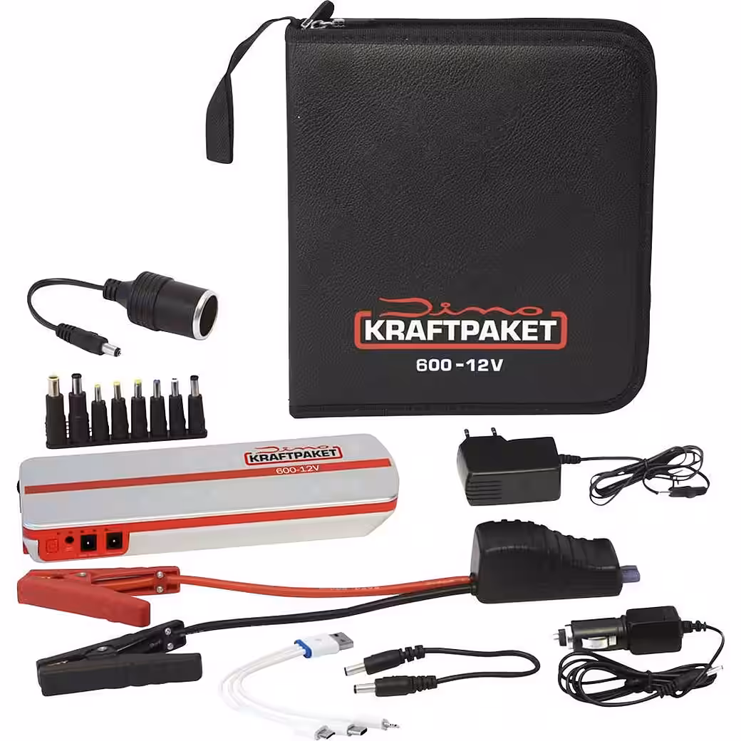 This powerful jump starter boasts a robust 18 Ah capacity and 600 A peak current, capable of starting all diesel engines up to 7.5 L and gasoline engines up to 8 L. It features an integrated power bank for charging cameras, laptops, mobile phones, notebooks, navigation devices, smartphones, portable game consoles, tablets, and for operating 12-volt car accessories with power supplies, such as air compressors or coolers. The comprehensive package includes jumper cables, a charging cable, and an adapter set, all housed together with the jump starter in a secure carrying case. To prevent incorrect connections, the Dino jump starter incorporates safety technology with reverse polarity protection, deep discharge protection, overcharge protection, low voltage warning, and intelligent jumper cables. The integrated LED light with three functions ensures you’re never left in the dark. This powerhouse is ideal for users who need a single device for all engine sizes, allowing them to charge and operate a wide range of electrical devices.