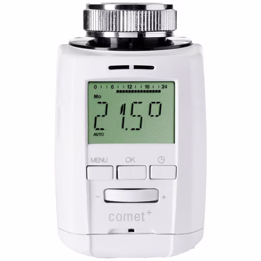 The Comet Plus radiator thermostat is the successor, the new design variant, of its predecessor, the Sparmatic Comet. This digital thermostat features a high-quality metal nut, ensuring a longer lifespan and even better stability. The Comet Plus electronic radiator thermostat is individually programmable. Four heating and four energy-saving periods can be set per day. Settings can be adjusted directly on the Comet Plus or, even more conveniently, via PC using the PROGmatic programming stick (not included, available as an accessory). Despite the programmed heating profile, the temperature can also be manually adjusted on the thermostat at any time. Thanks to its open-window detection, the Comet Plus recognizes when a room is being ventilated and immediately closes the radiator valve to save energy. The valve only reopens when the temperature rises or after a user-defined period. The various functions of the Comet Plus can save up to 30% on heating costs.