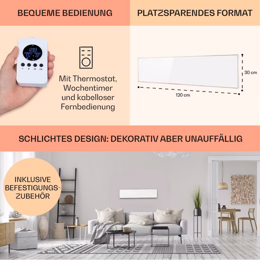 • FOR EVERY ROOM: Thanks to the IP54 water and dust protection, the infrared heater is also suitable for use in the bathroom. The scope of delivery includes everything you need for assembly.