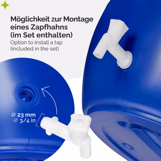 Versatile rain barrel for numerous applications: Our practical barrel with lid, suitable as a rainwater tank, water barrel, wine barrel, or fermentation vessel, is a versatile, waterproof container made of BPA-free, weather-resistant, and UV-resistant plastic that is food-safe and suitable for use in the food industry. This robust barrel is ideal for the safe storage of water, animal feed, and dry goods such as grains or pellets. The protective lid ensures that the contents remain fresh and are reliably protected from moisture and pests. Thanks to its lightweight design, the container is easy to transport and handle. Easy cleaning and versatile use: The smooth surface of the rain barrel facilitates cleaning, which is particularly advantageous when used in the food and pharmaceutical sectors. This ensures easy maintenance and hygienic storage. Whether on the farm, in the garden, in the garage or in the household – this container is the ideal solution for storing water, transporting water, animal feed and dry products such as cat litter, or for use as a wine barrel, fermentation barrel, fermentation container and for waste separation.