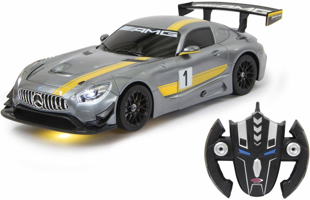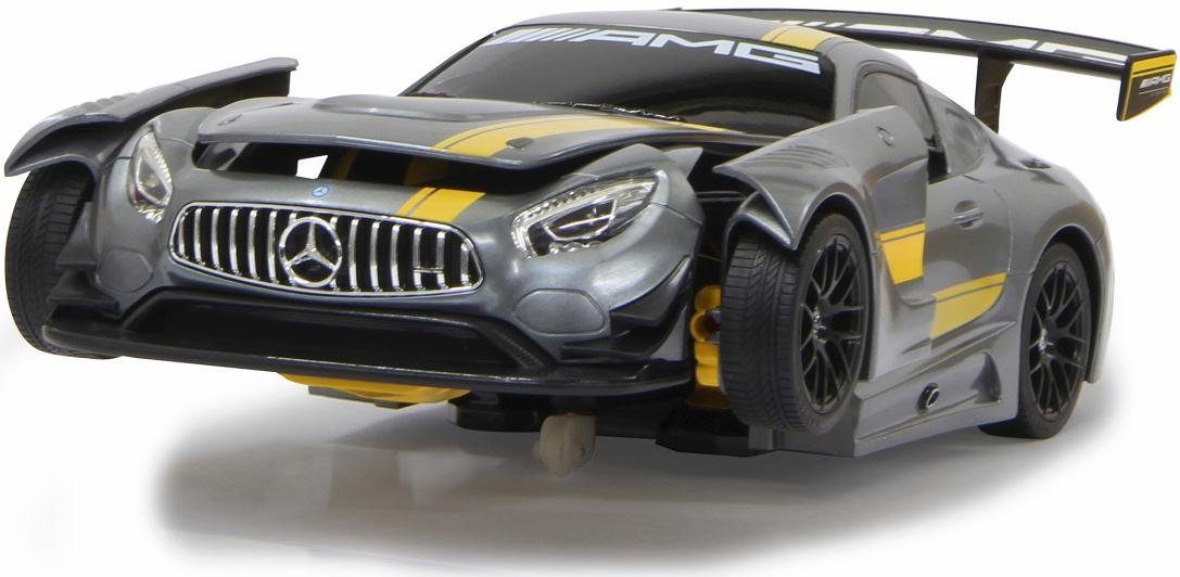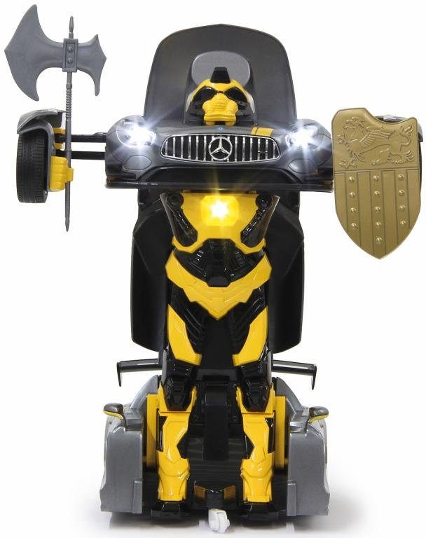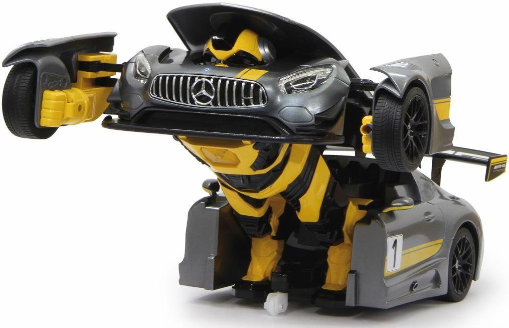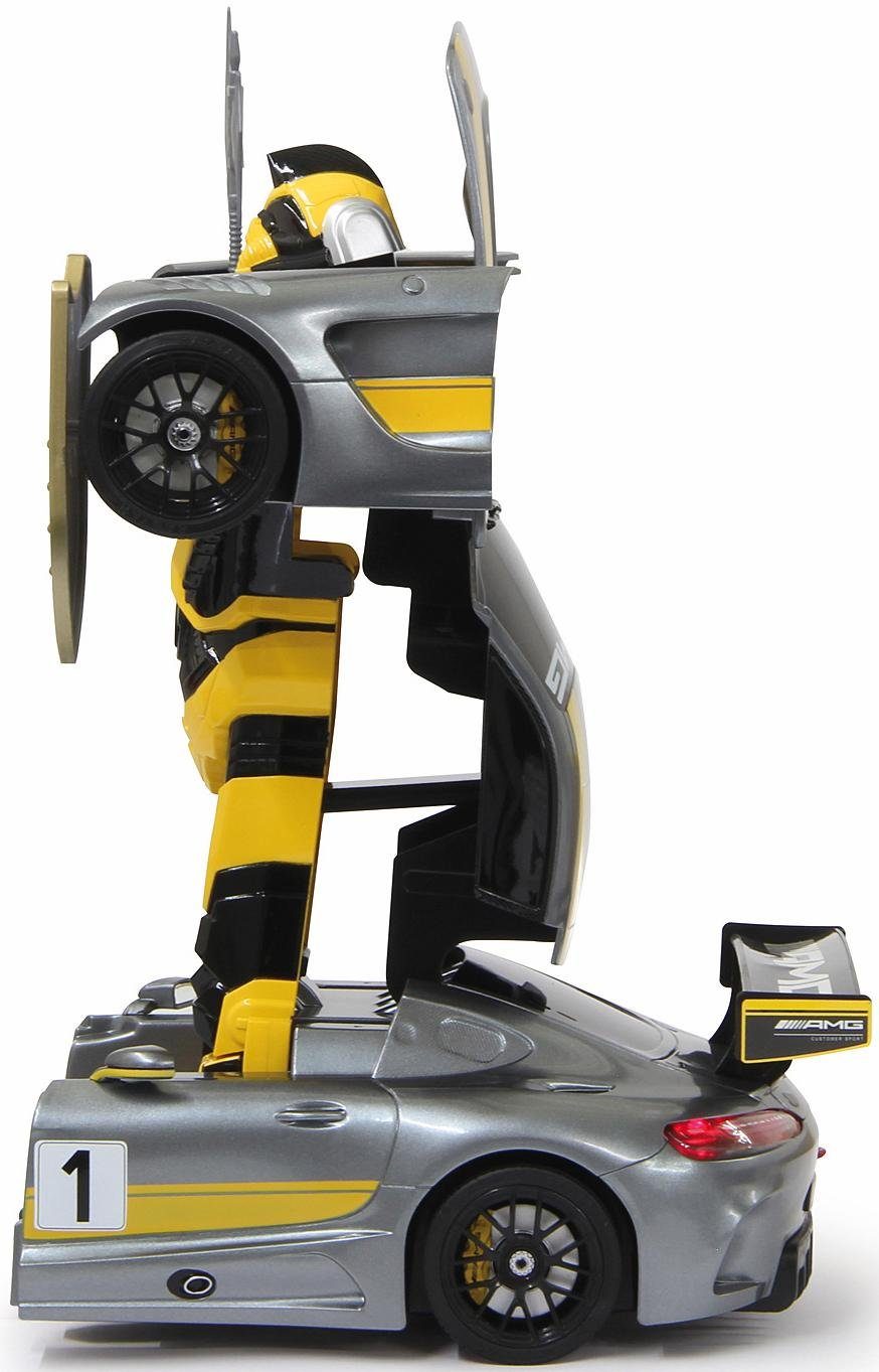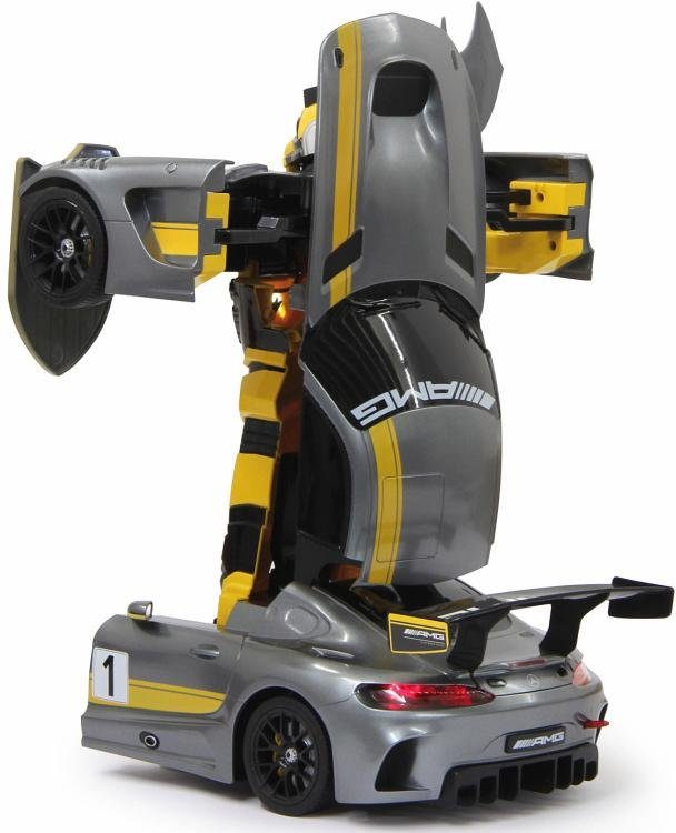 The super-cool “Mercedes AMG GT3 transformable, 2.4 GHz, grey” robot from JAMARA is hidden inside a truly fast race car. At the touch of a button, the racing car transforms, and action-packed role-playing games can begin. Both versions are detailed and therefore look impressive. The best part: In robot mode, the toy has a speaker with a built-in dance mode. Once it transforms back into the car, it zooms around the track at high speed. It offers fantastic driving possibilities and exciting maneuvers. Varied fun for children aged 6 and up: With the super-cool “Mercedes AMG GT3 transformable, 2.4 GHz, grey” robot from JAMARA.