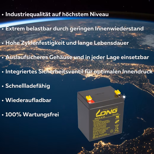 The Kung Long WP4.5-12 is a high-performance, maintenance-free lead-acid battery with a nominal capacity of 4.5 Ah and a nominal voltage of 12 volts. Thanks to its compact dimensions of 90 x 70 x 101 mm and Faston 187 (4.8 mm) terminals, it is suitable for a wide range of applications, such as emergency and safety lighting, fire alarm systems, security alarm systems, industrial applications, UPS systems, IT/telecommunications, and commercial use. Rely on the high quality and reliability of the Kung Long WP series standard AGM lead-acid battery.