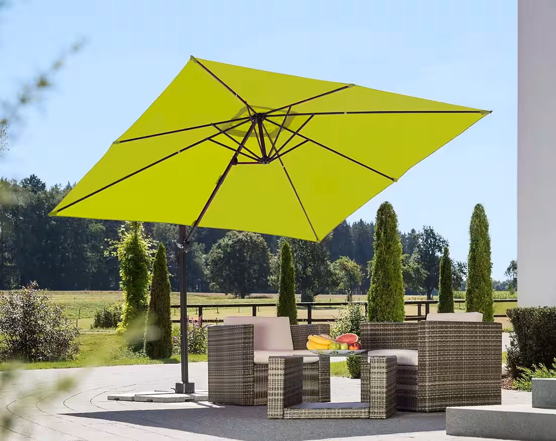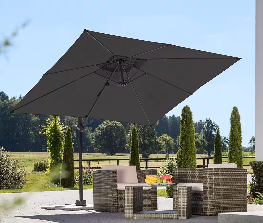 Summer is finally here! We’ve been looking forward to our sun loungers for ages – preferably under a parasol! The “Rhodos Junior” cantilever parasol, with its high-quality, easy-care fabric canopy offering UV protection 50+, ensures relaxed sunbathing without any risk to your skin. The frame is made of weatherproof aluminum, and to provide shade exactly where you need it, the parasol can be rotated and tilted 360° using a foot pedal. The parasol comes with a base (plates not included) and a high-quality protective cover with a zipper and pole. Sunbathing in the shade couldn’t be more enjoyable!