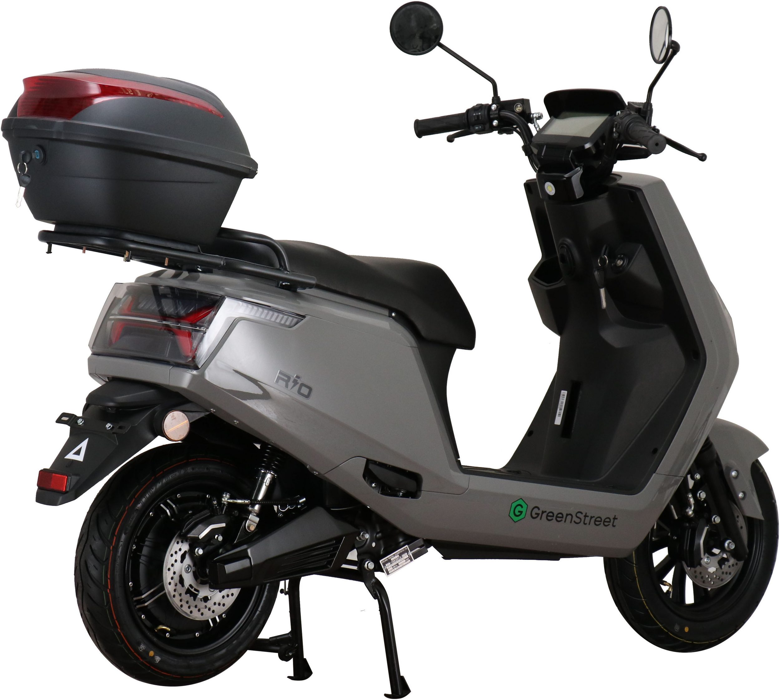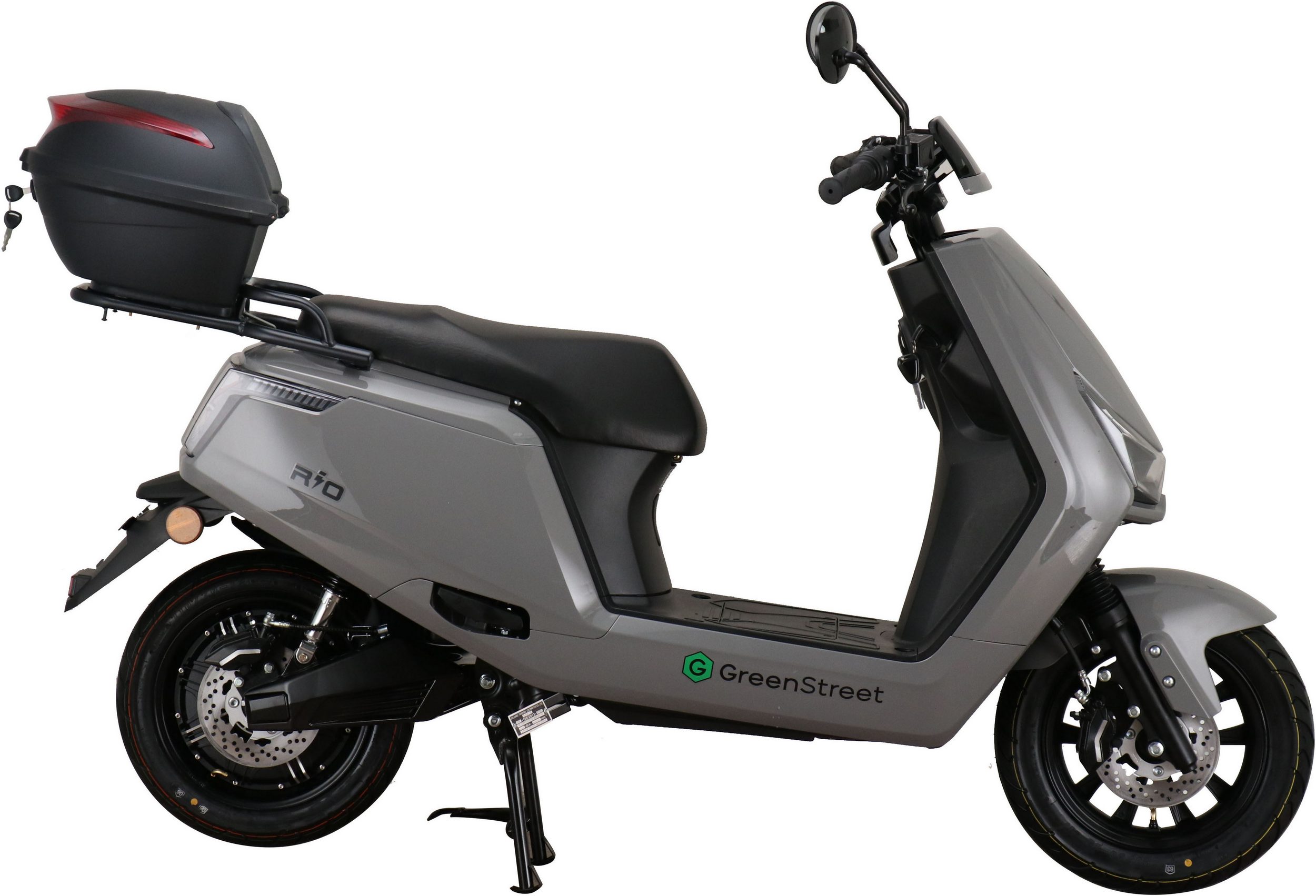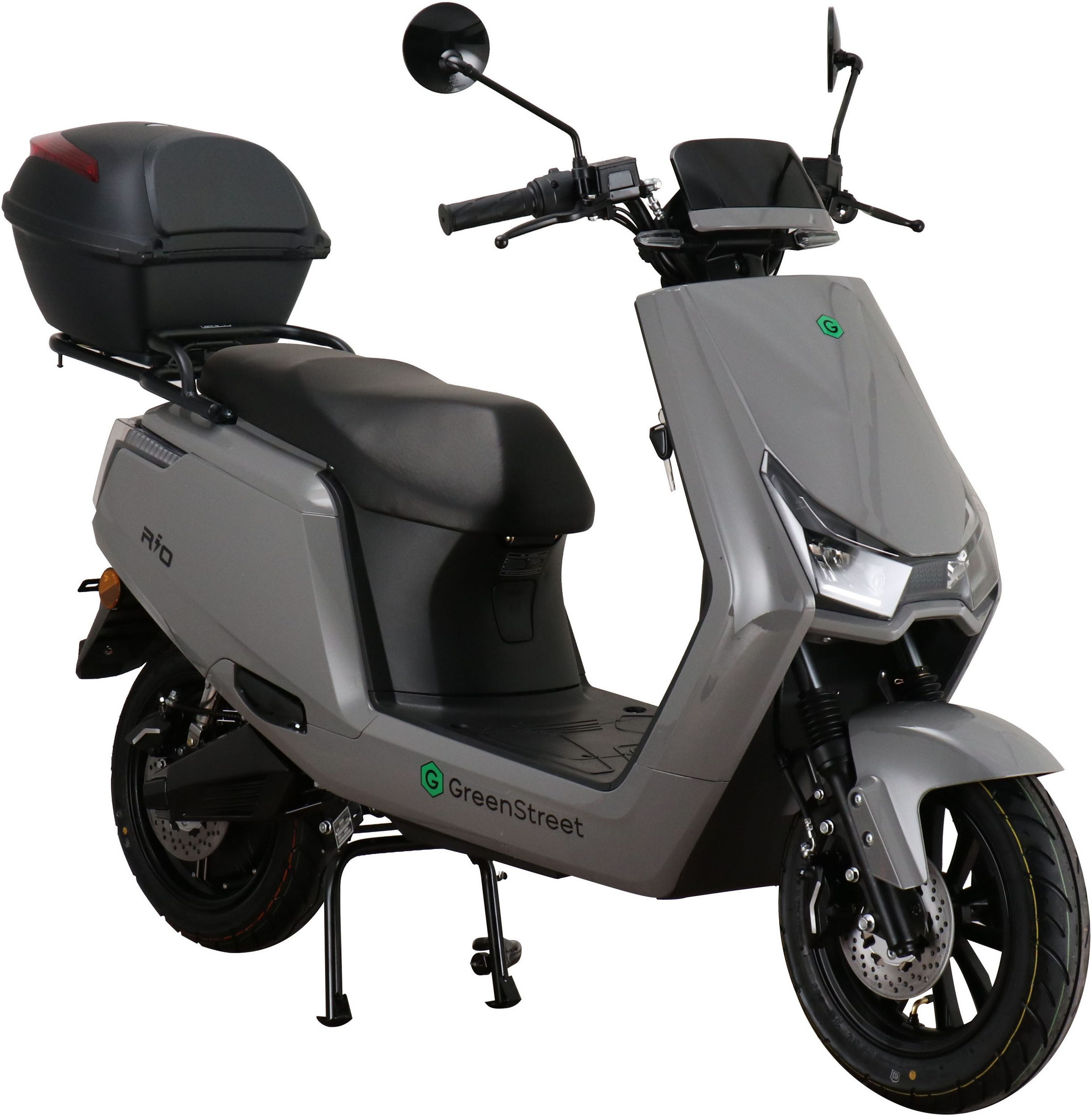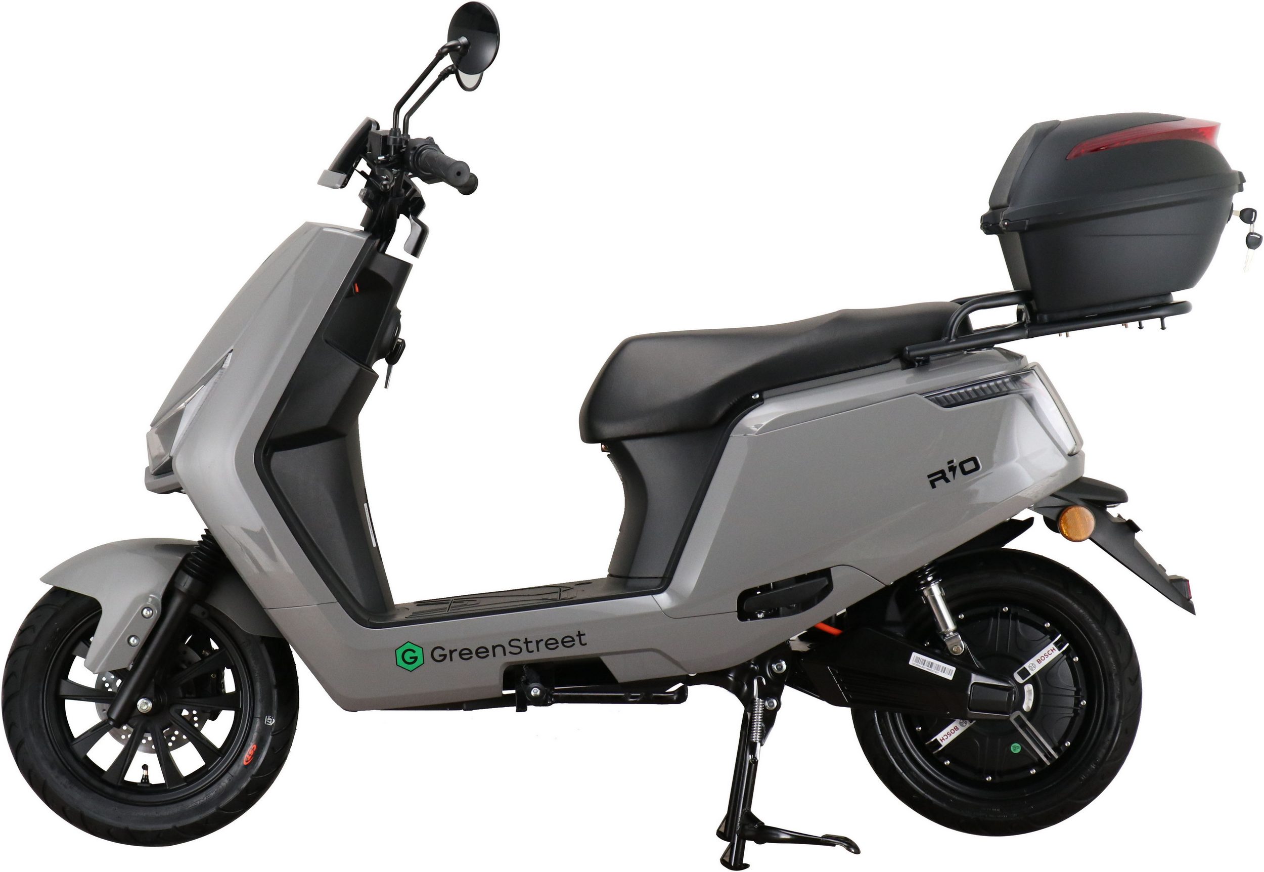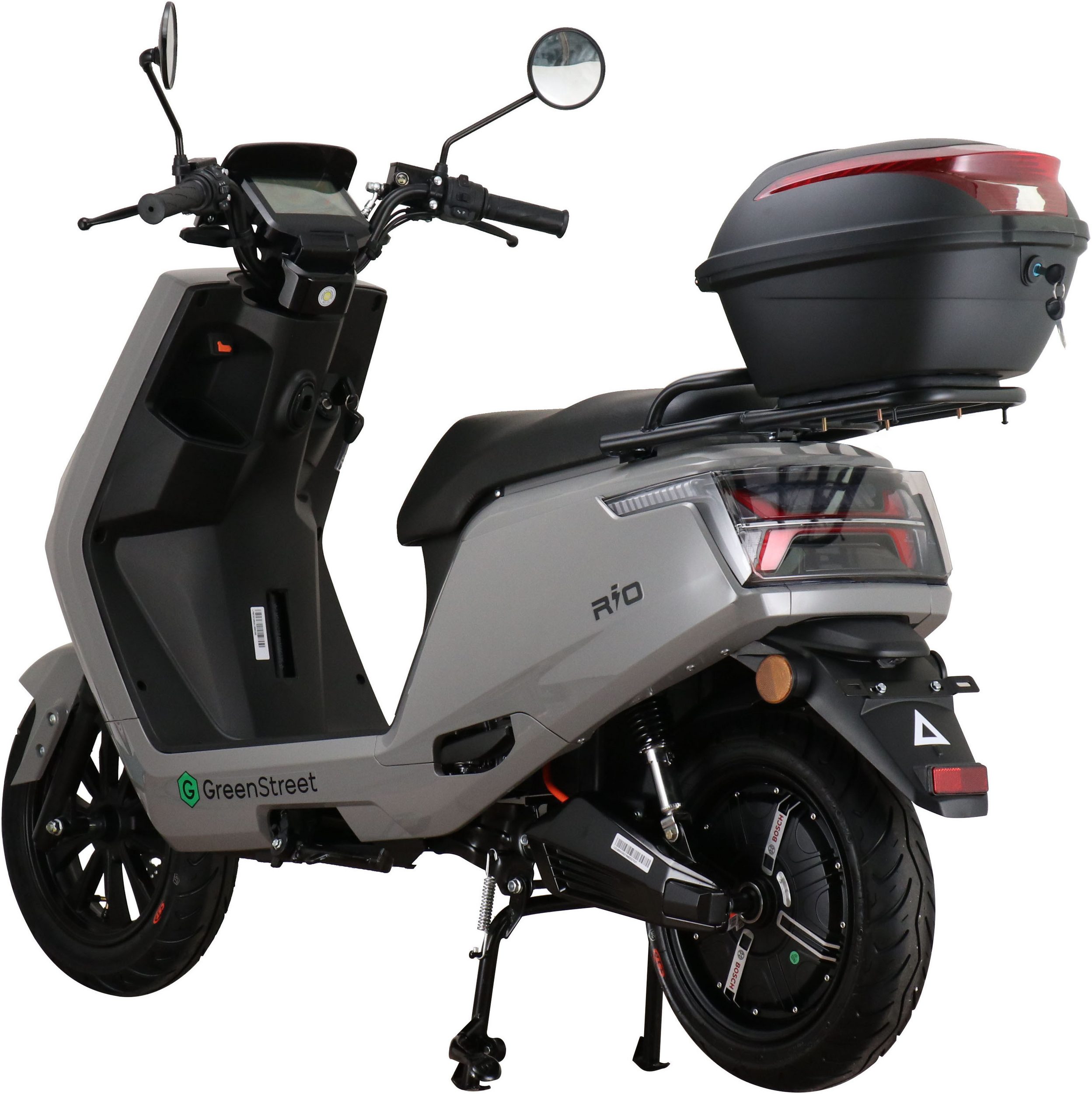 The GreenStreet Rio electric scooter embodies modern design. Its 2000-watt Bosch brushless hub motor effortlessly accelerates the scooter to a top speed of 25 km/h. The powerful lithium-ion battery provides a range of approximately 90 km. The range depends on the load, usage, terrain, tire pressure, and temperature. The lithium-ion battery is easily removable and can be charged using the included charger at any standard 230-volt household outlet. A full charge takes 5-6 hours. The e-scooter also features a comfortable 12-inch chassis, fully hydraulic disc brakes front and rear, and an LED lighting system. A steering lock and lockable battery compartment ensure the necessary security for everyday use. Low running costs further enhance the enjoyment of riding the Rio electric scooter.