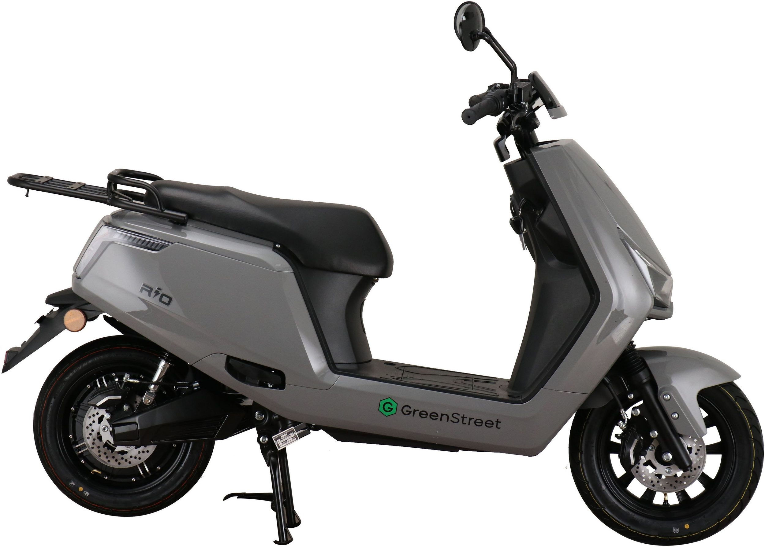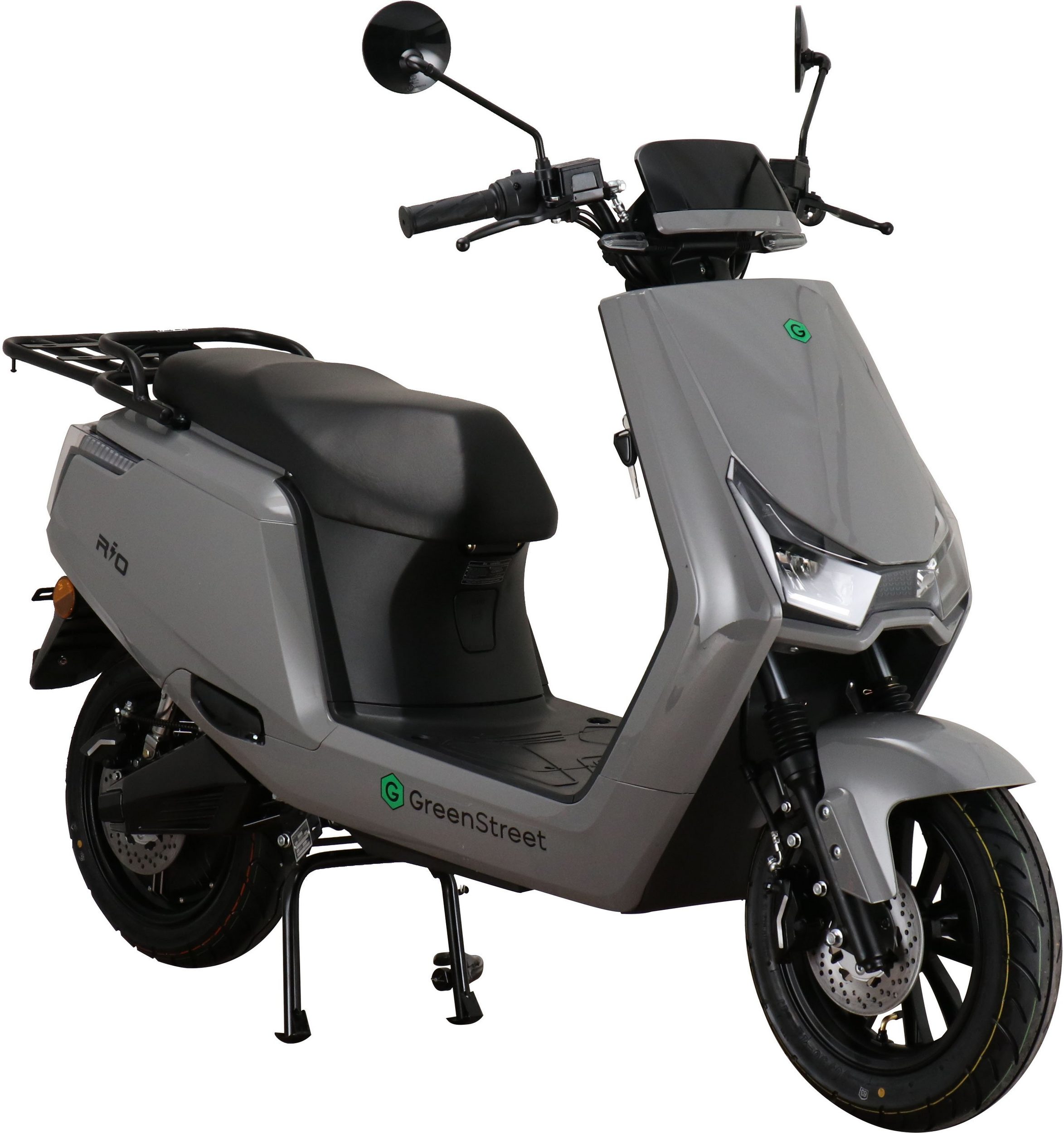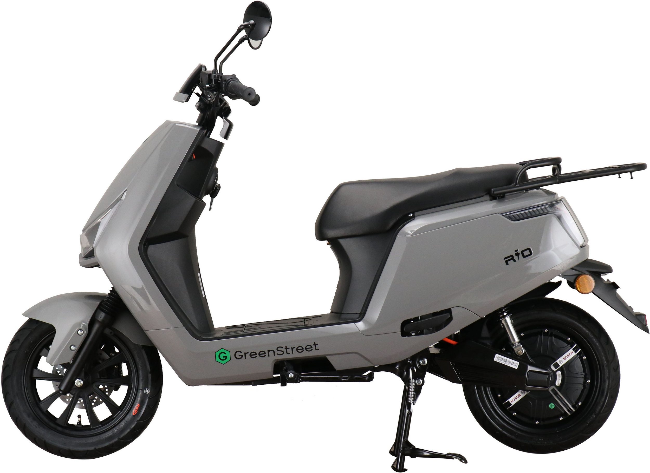 The GreenStreet Rio electric scooter embodies modern design. Its 2000-watt Bosch brushless hub motor effortlessly accelerates the scooter to a top speed of 25 km/h. The powerful lithium-ion battery provides a range of approximately 100 km. The actual range depends on the load, usage, terrain, tire pressure, and temperature. The lithium-ion battery is easily removable and can be charged using the included charger at any standard 230-volt household outlet. A full charge takes 5-6 hours. The e-scooter also features a comfortable 12-inch chassis, fully hydraulic disc brakes front and rear, and an LED lighting system. A steering lock and lockable battery compartment ensure the necessary security for everyday use. Low running costs further enhance the enjoyment of riding the Rio electric scooter.