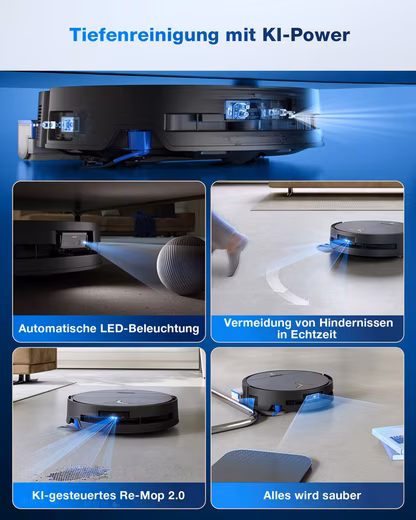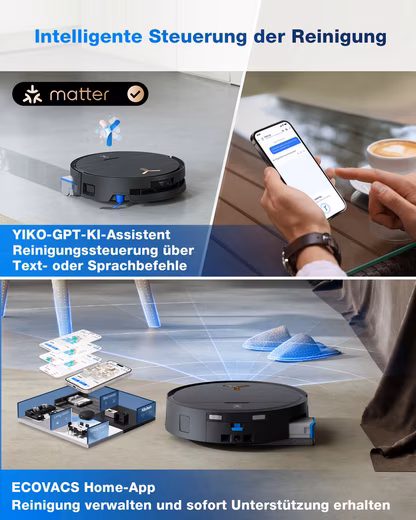 PREMIUM TECHNOLOGY: Thanks to AIVI 3D 3.0 Omni-Approach technology, DEEBOT uses deep learning and real-time route planning for precise object detection and dynamic obstacle avoidance. The structured laser light and TruEdge 3D edge sensor allow for thorough cleaning along edges while adapting to changes in the environment, such as moving people or animals. The AI Stain Detection 2.0 feature detects and categorizes stains and selects targeted cleaning strategy for optimal results. The intuitive YIKO Assistant, based on a Large Language Model, allows users to effortlessly control the robot via text or voice. The sleek, 98 mm high design as well as the grippy wheels improve maneuverability on various surfaces.