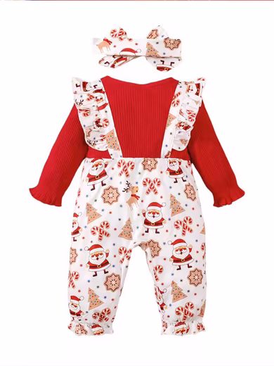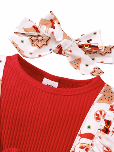 This specially designed Christmas romper for girls features warm, festive prints. It cleverly combines solid colors and prints to create a festive, cheerful, and romantic atmosphere.