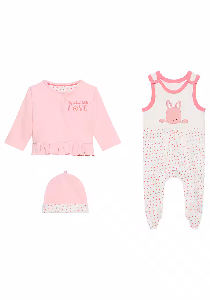 This means that every outfit — the set with romper, jacket and hat »3 piece baby set, for little girls« from KIDSWORLD fits!
