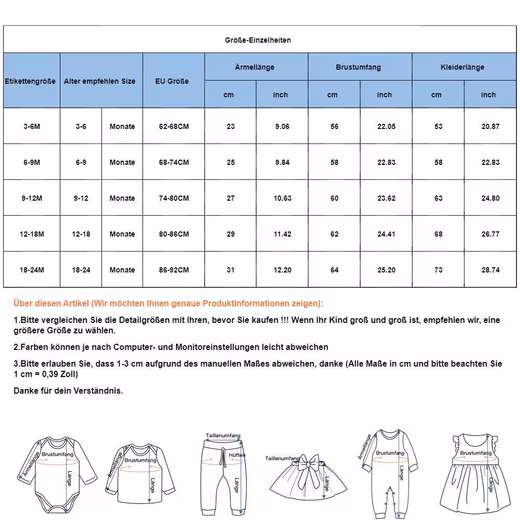 It is recommended to refer to the size chart to find the right size for your baby. Due to manual measurement, there may be deviations of 1-3 cm. Please understand.