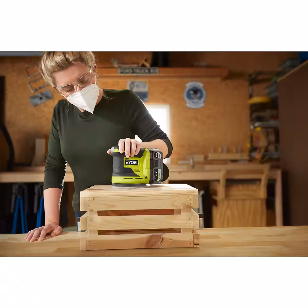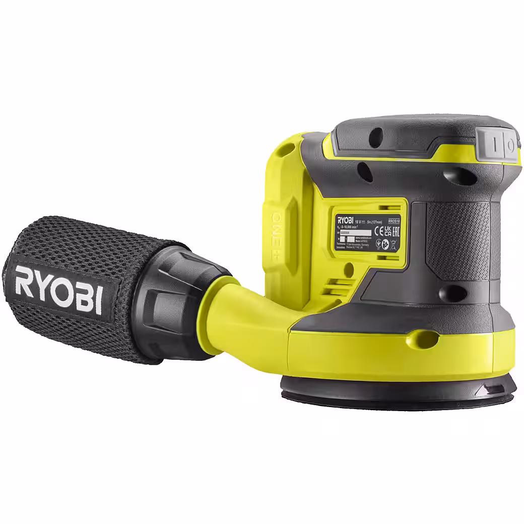 Battery and charger not included. The Ryobi ONE+ RROS18-0 cordless random orbital sander delivers excellent sanding results and can be used with one hand. The rubberized grip provides a secure hold, increased comfort, and greater efficiency. The switch can be locked for convenient continuous operation. The 2.5 mm orbital sanding motion ensures fast and efficient material removal and is perfect for light to medium-duty work such as fine sanding or paint removal. The integrated active dust extraction system with dust bag ensures a clean work area. The Ryobi RROS18-0 cordless random orbital sander can use sanding discs with a diameter of 125 mm. The hook and loop fastening allows for quick and easy sandpaper changes. Ryobi IntelliCell monitors each cell of the ONE+ battery, maximizing runtime per charge and increasing battery life. This unique power management system delivers optimal performance and runtime for all ONE+ tools and applications