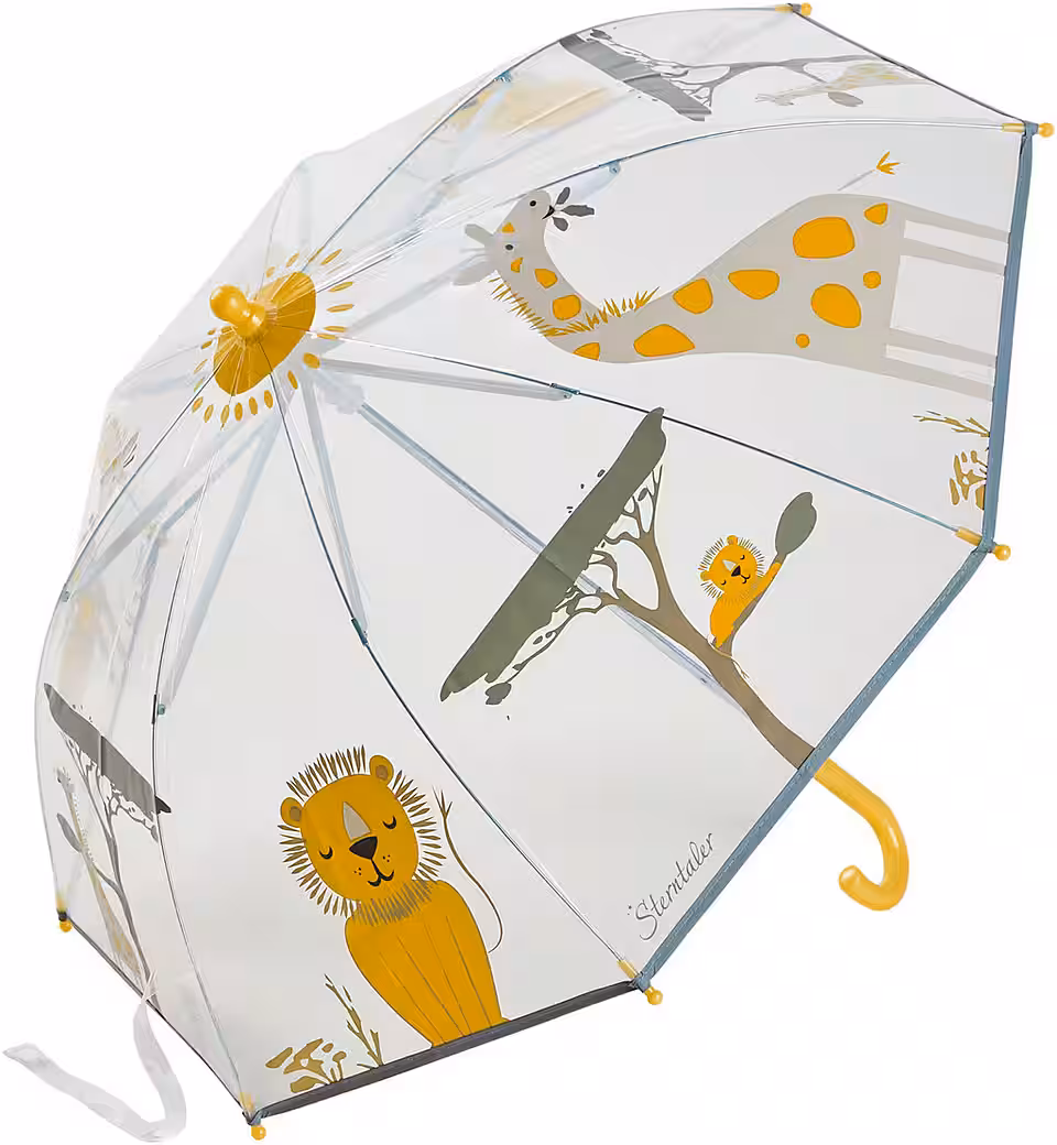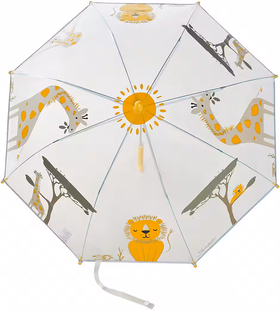 This practical, transparent umbrella with a great safari motif featuring Kaya the giraffe and Leo the lion protects little adventurers from raindrops and snowflakes. The semicircular handle of this stick umbrella is easy for children to hold. The canopy and pole ends are rounded, and the reflective piping ensures good visibility on cloudy days.