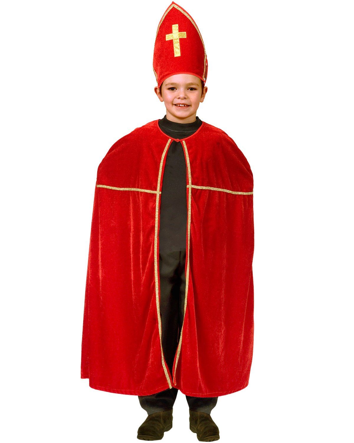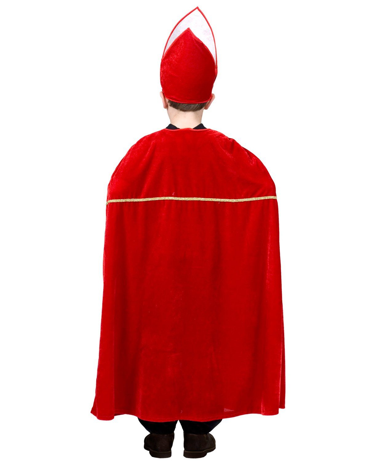 • Saint Nicholas children’s costume consisting of cape and mitre • Beautiful costume for nativity plays, Christmas parties, and theater • Cape length approx. 95 cm • Recommended size: 116-140 cm With this beautiful costume, you can transform your child into Saint Nicholas or a bishop for Christmas, nativity plays, Christmas performances, or theatrical productions! The children’s costume consists of a cape and a mitre. The hat and cape are made of a velvety material and are therefore very comfortable to wear. Perfect as a Christmas costume, for school plays, Christmas performances, or Christmas market appearances!