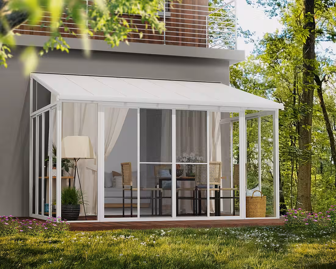 Canopia SanRemo Conservatory Accessories Fly Screens in White. With a set of SanRemo fly screen doors from Palram – Canopia, you can enjoy the fresh breeze without insects bothering you. The screen door set is mounted on its own track; there’s no need to remove the doors. Simply attach the pre-assembled sliding fly screen doors to one or all sides of the SanRemo 3 for a seamless front. • Enjoy fresh air without insects bothering you • Frame material: powder-coated aluminum • Screen material: polyester • Color: white • Quick and easy installation • Pre-assembled screen doors • Mounts on its own track • No need to remove doors for installation • The set includes a double fly screen door • Set includes 1 door set of your choice
