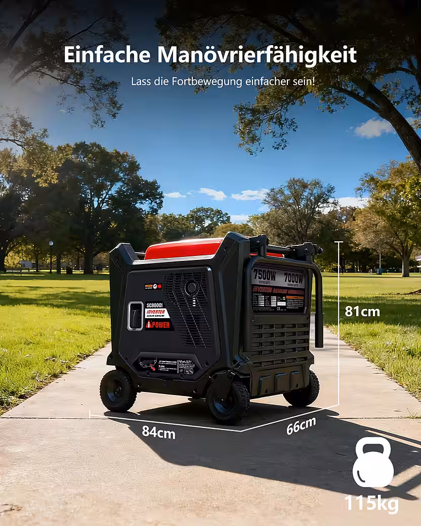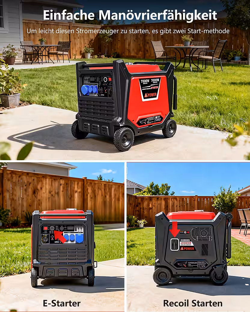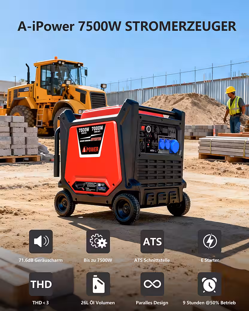 • The 4-stroke OHV engine provides a stable power source. The A-iPower generator has a maximum output of 7500W and a continuous output of 7000W, making it a portable emergency power generator for camping, construction sites, and emergencies.