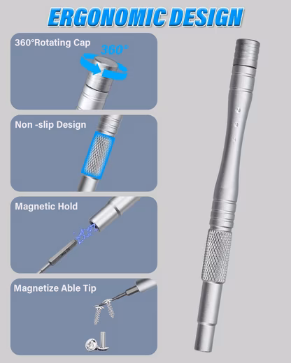 360° Rotatable and Magnetic Design: The top of the handle of this precision screwdriver can be rotated 360°, allowing for easier handling and more precise control when tightening or loosening screws. Magnetic screwdrivers can hold small screws and metal parts, reducing the risk of slipping or dropping them during repairs and preventing the loss of important components.