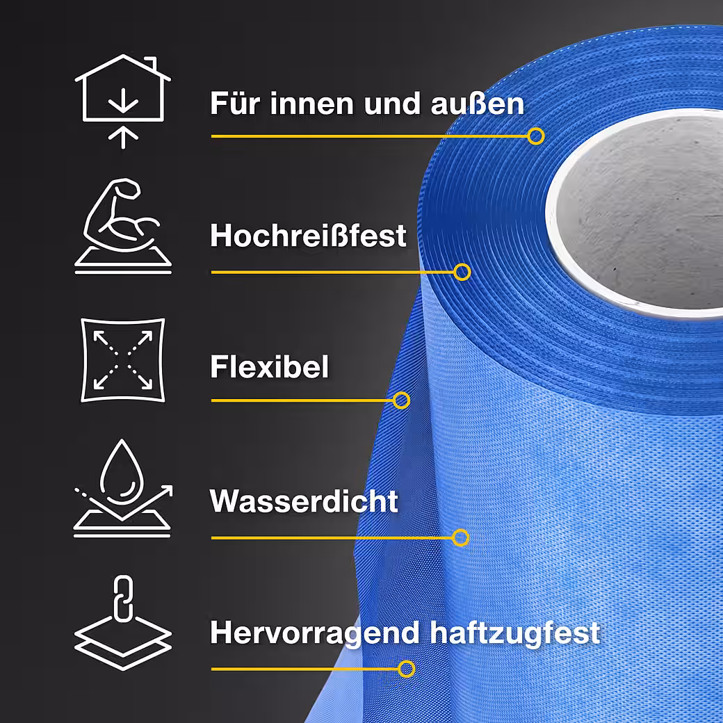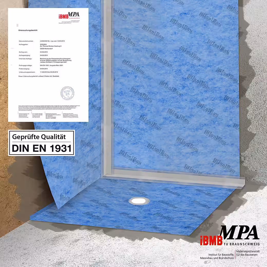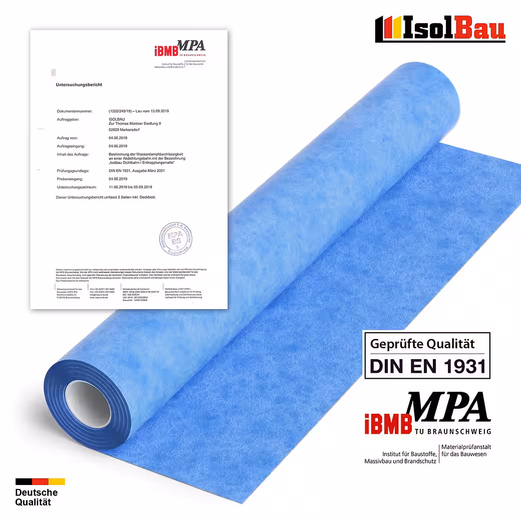 IsolBau sealing membrane 6 x 30 m² roll (30 m long x 1 m wide)IsolBau sealing membrane is an MPA-certified, waterproof, vapor-retardant, tear-resistant trilaminate membrane in blue, made of high-quality, modified polyethylene, coated on both sides with a special polypropylene nonwoven fabric, offering excellent adhesion and suitable for all liquid sealants and tile adhesives. It is ideal for sealing joints under ceramic coverings in wet areas such as bathrooms, toilets, showers, and utility rooms, as well as in outdoor areas like patios and balconies. This is essential – in bathrooms and kitchens, whether during renovation or new construction, our IsolBau sealing membrane reduces the risk of water damage for both interior and exterior use.