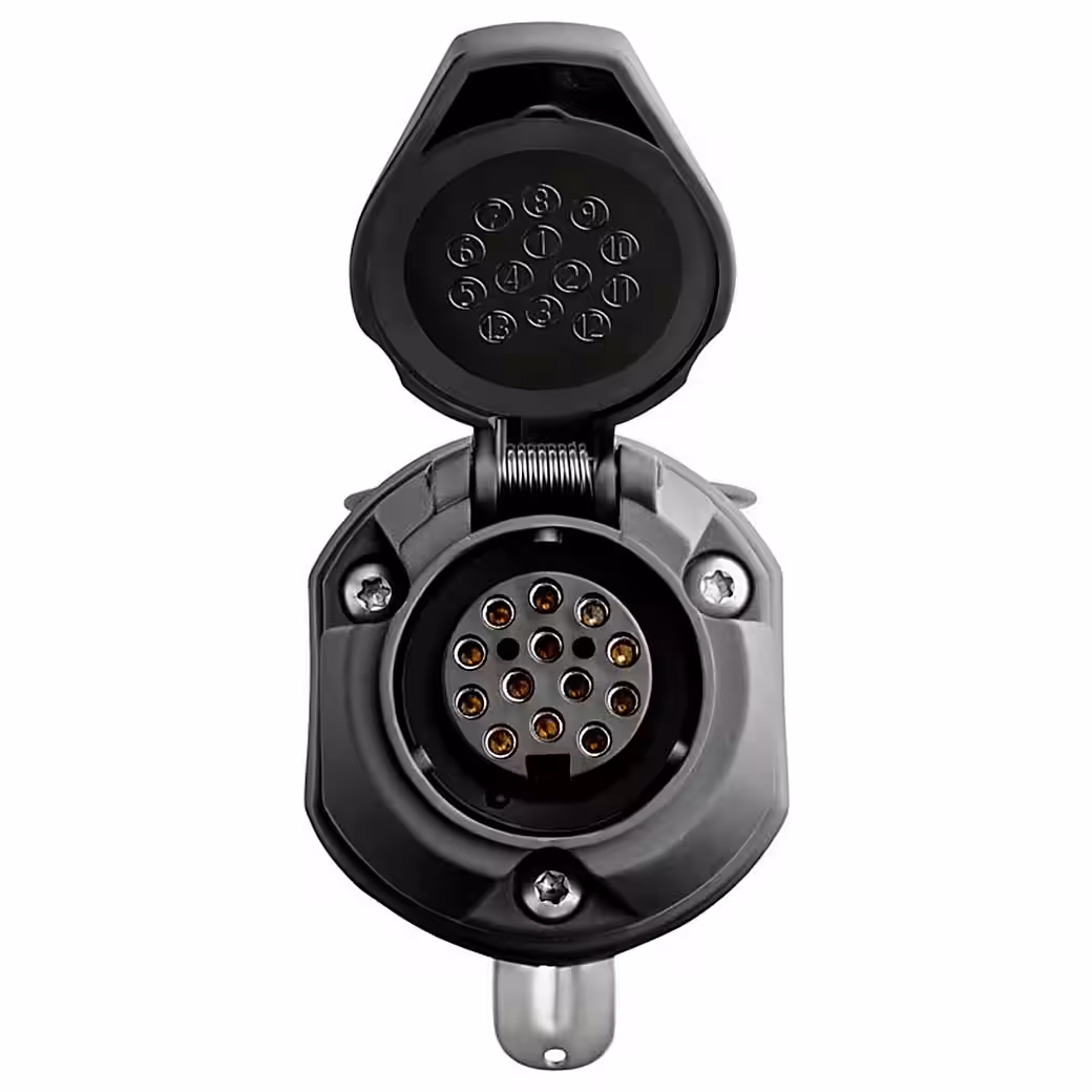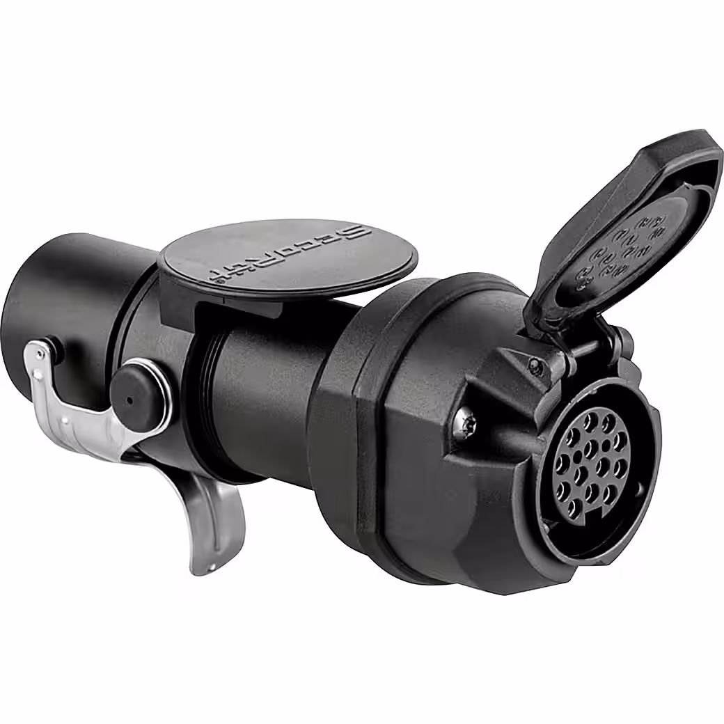 Robust adapter for connecting a 13-pin car trailer socket to a 15-pin truck socket according to ISO 12098. Ideal for use in commercial vehicles and mixed fleets.