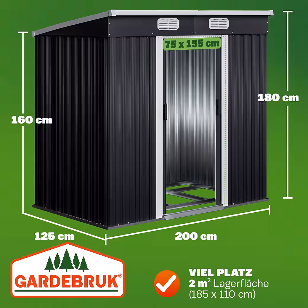 - Scope of delivery: Garden shed 4 m³, L 200 x W 125 x H 185 cm, 2 fixtures with 2 hooks each, up to 15 kg, including foundation. Material: galvanized sheet steel. Color: anthracite.