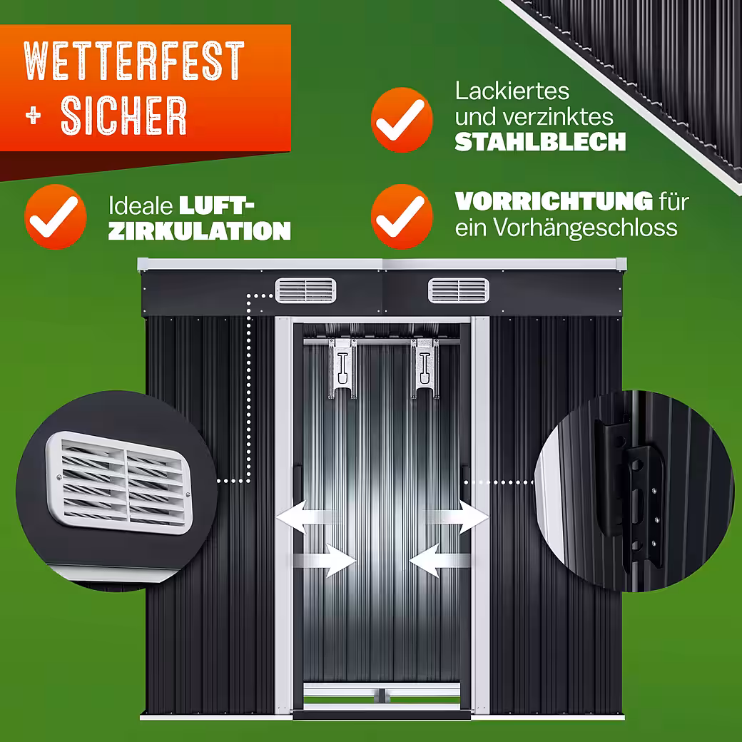 - WEATHERPROOF: In the weatherproof metal garden shed, your garden tools remain protected from the elements and dirt.