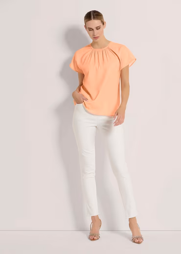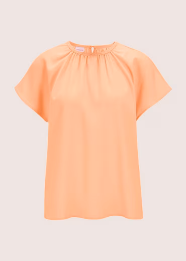 The perfect addition to carefree summer looks, and almost too good to wear underneath! The slightly flared A-line of this short-sleeved blouse-style shirt follows the fashion zeitgeist, and small pearl beads add sparkle to the pleated round neckline. A button-loop closure at the back ensures easy on and off.