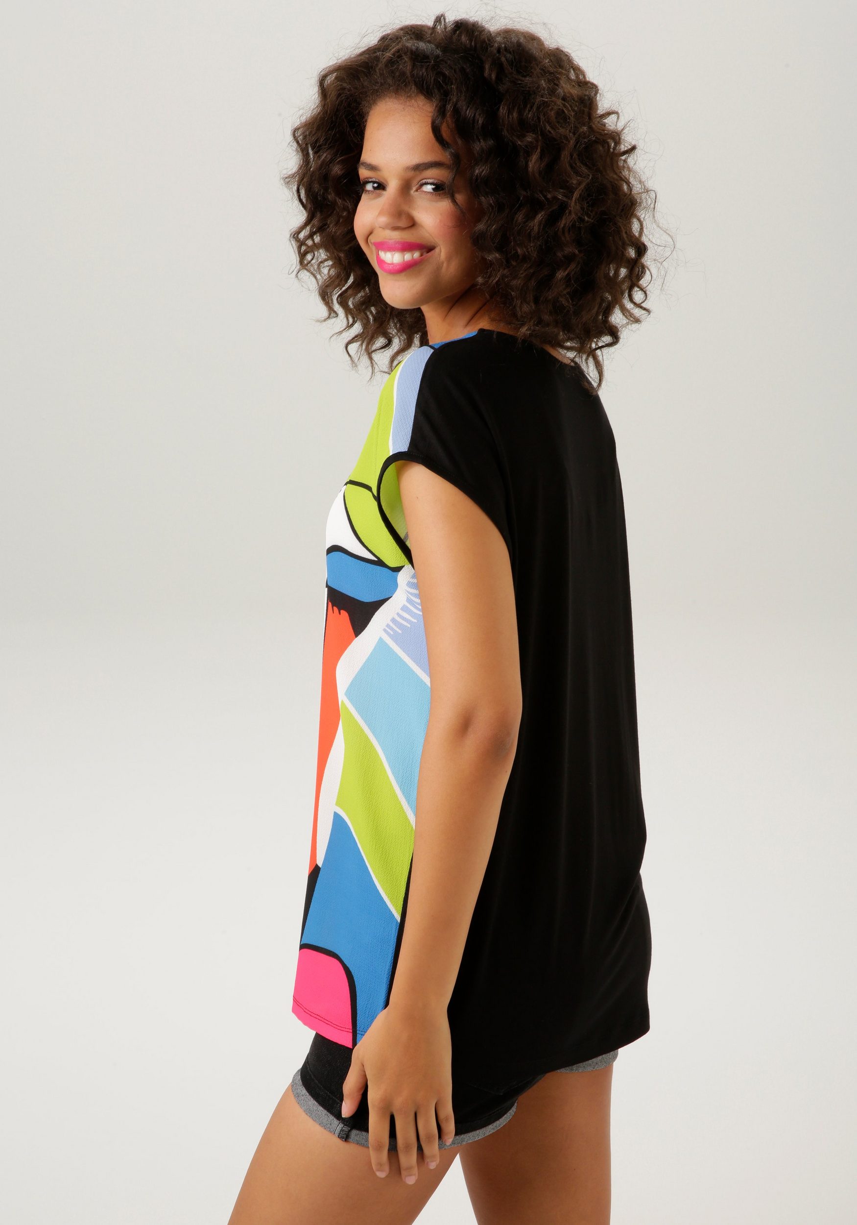 Like a painting – the blouse by Aniston CASUAL. Featuring an artistic face print. Round neckline and dropped shoulders. Printed front made of polyester crepe. Plain jersey back made of stretch viscose. Figure-hugging blouse top. Length in size 36 approx. 64 cm. Machine wash.