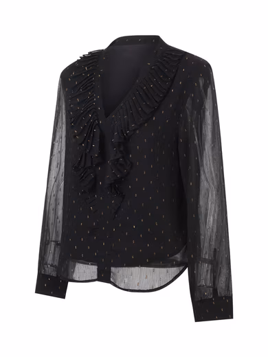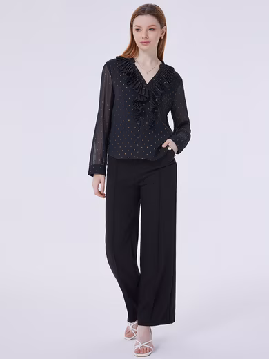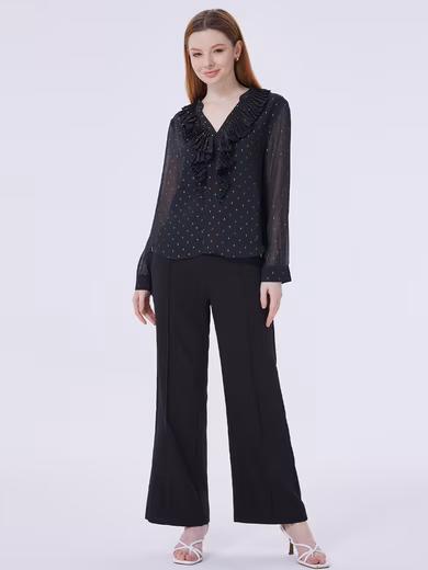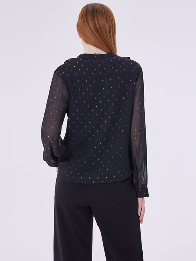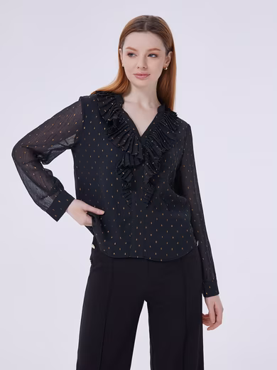 Of particular note, the shirt is covered in delicate gold dot prints, giving it a subtle and luxurious look, exuding enchanting charm with every gesture. The wavy hem design is unique and adds fluidity and fashion elements to the shirt. Whether paired with trousers or a skirt, it can easily create a distinctive look.