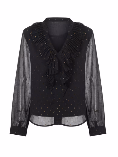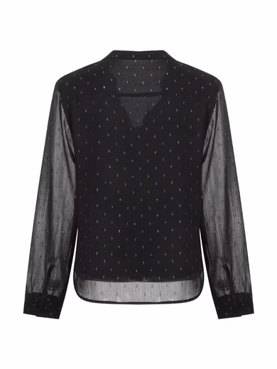 Discover the perfect combination of extreme elegance and comfort – this long-sleeved black casual shirt for women is a classic must-have in your wardrobe. The unique design features semi-sheer sleeves that add a touch of mystery to your everyday look. The V-neck with exquisite draping not only enhances the overall design but also cleverly modifies the neckline, thus highlighting the feminine temperament.