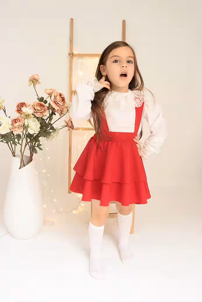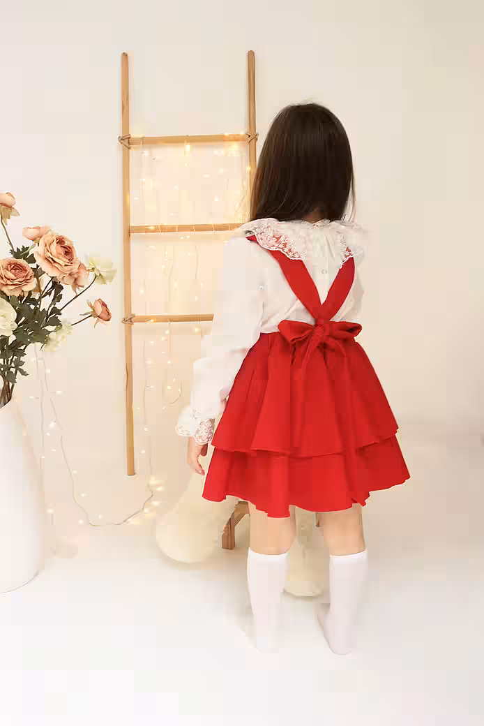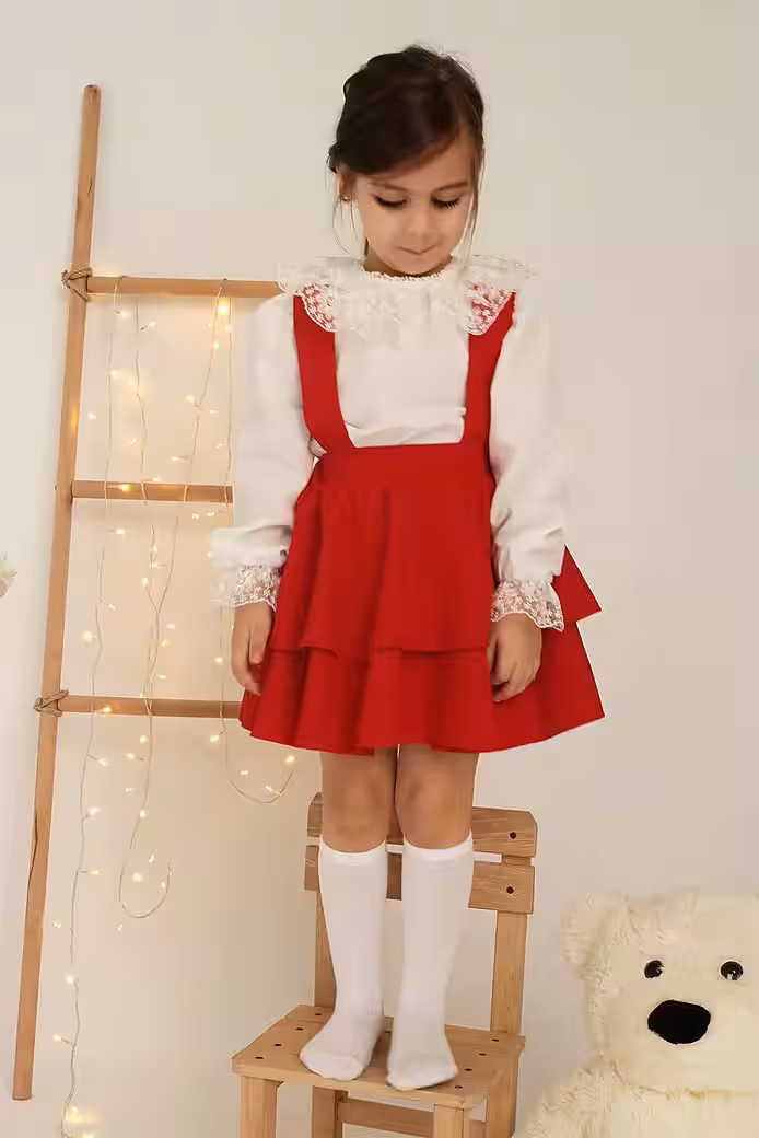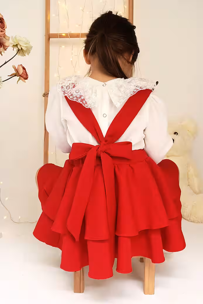 This unique red dress for girls combines a long sleeve shirt with delicate lace details and a two-tiered bell skirt with straps. The red hue of the dress expresses the enchanting elegance of this design.