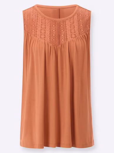 Fashionable dandy! Lightweight shirt top in soft viscose stretch fabric. Subtly sheer lace on the front below the round neckline. The gathers give it a beautifully loose, concealing fit.
