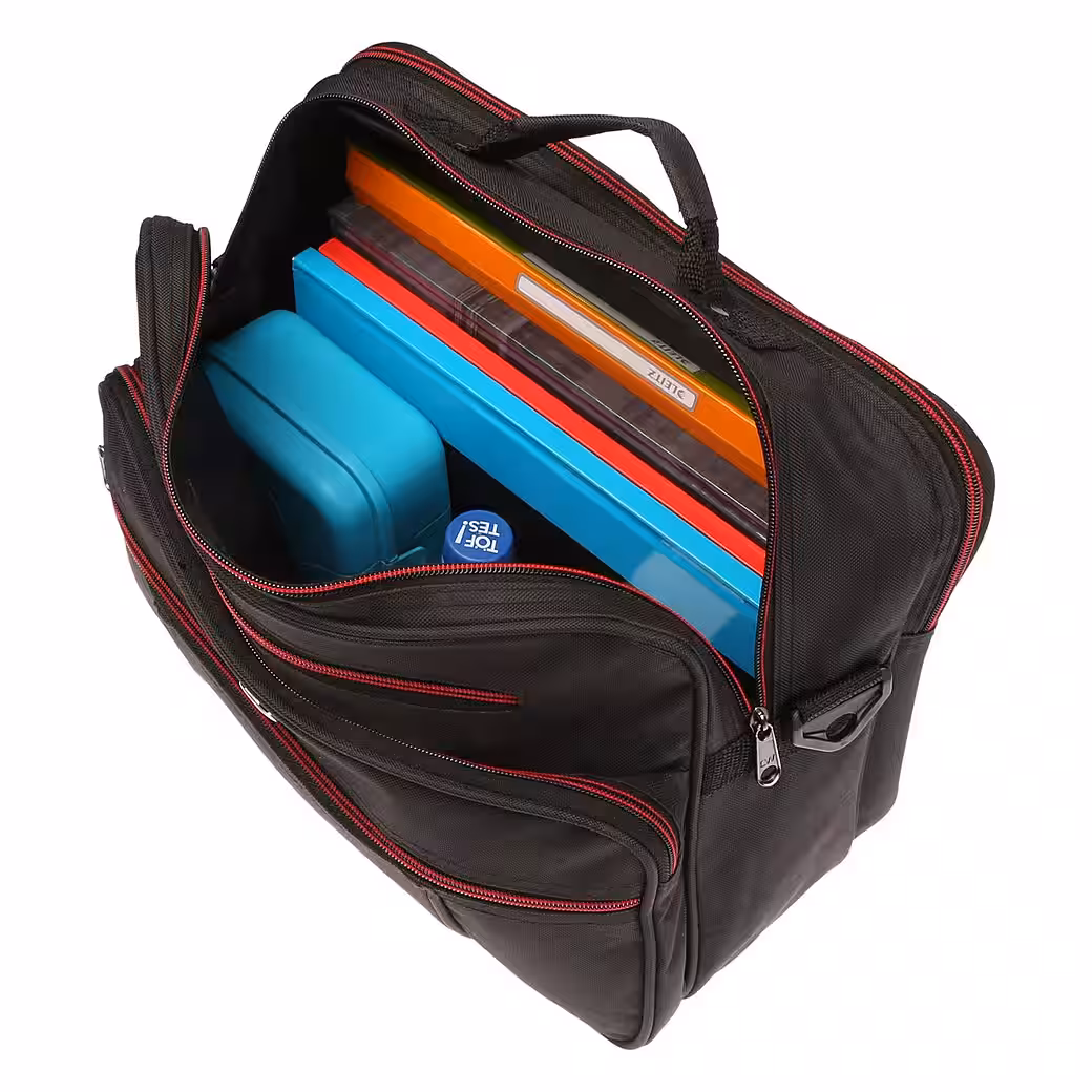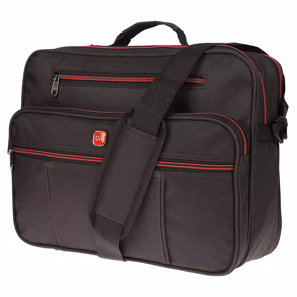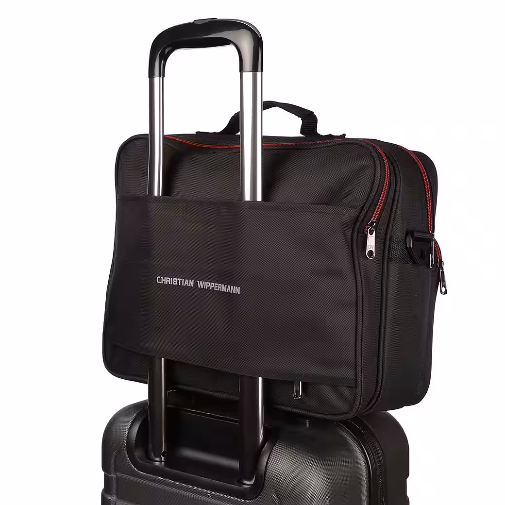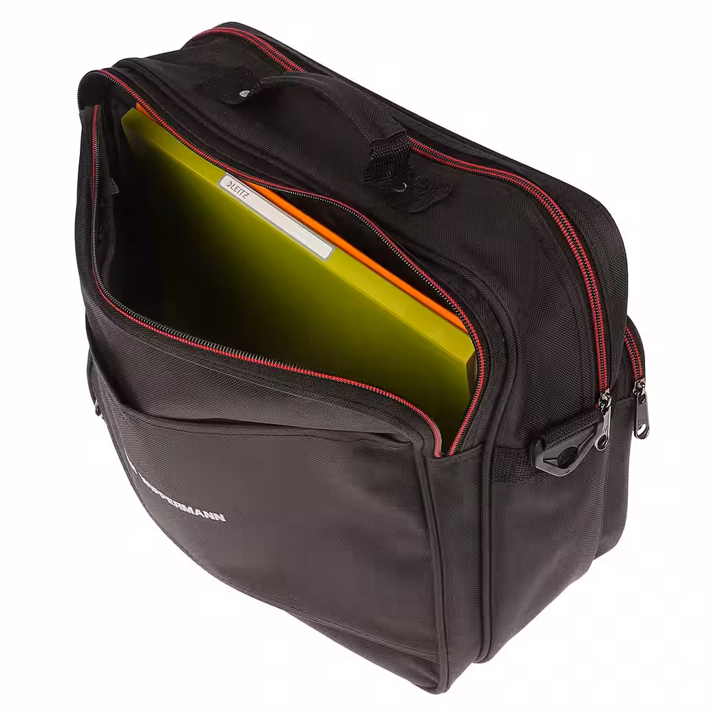 - Large shoulder bag in landscape format; Dimensions: approx. 39x30x16cm (BreitexHeightxDepth); Material: Polyester, highly water-repellent; A large main compartment suitable for DIN A4 folders; With trolley holder