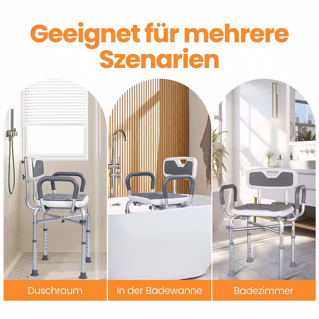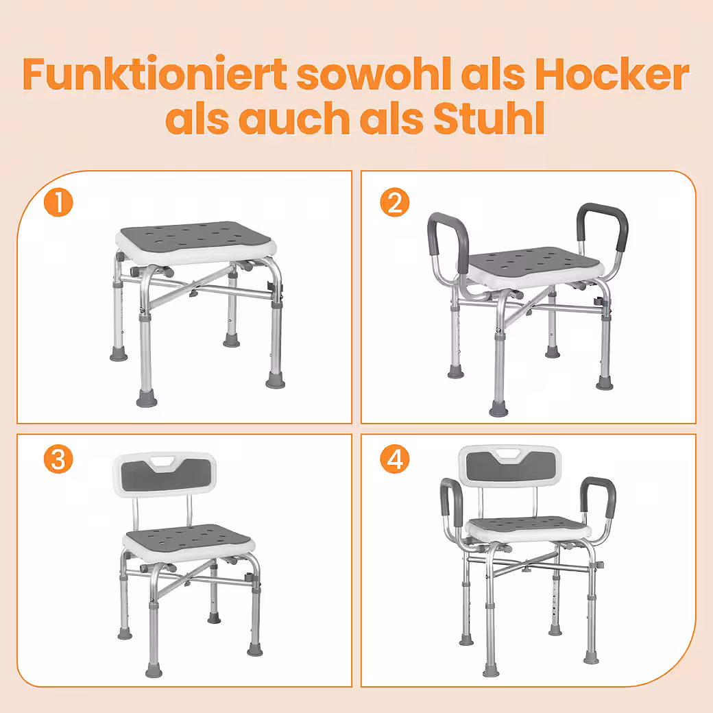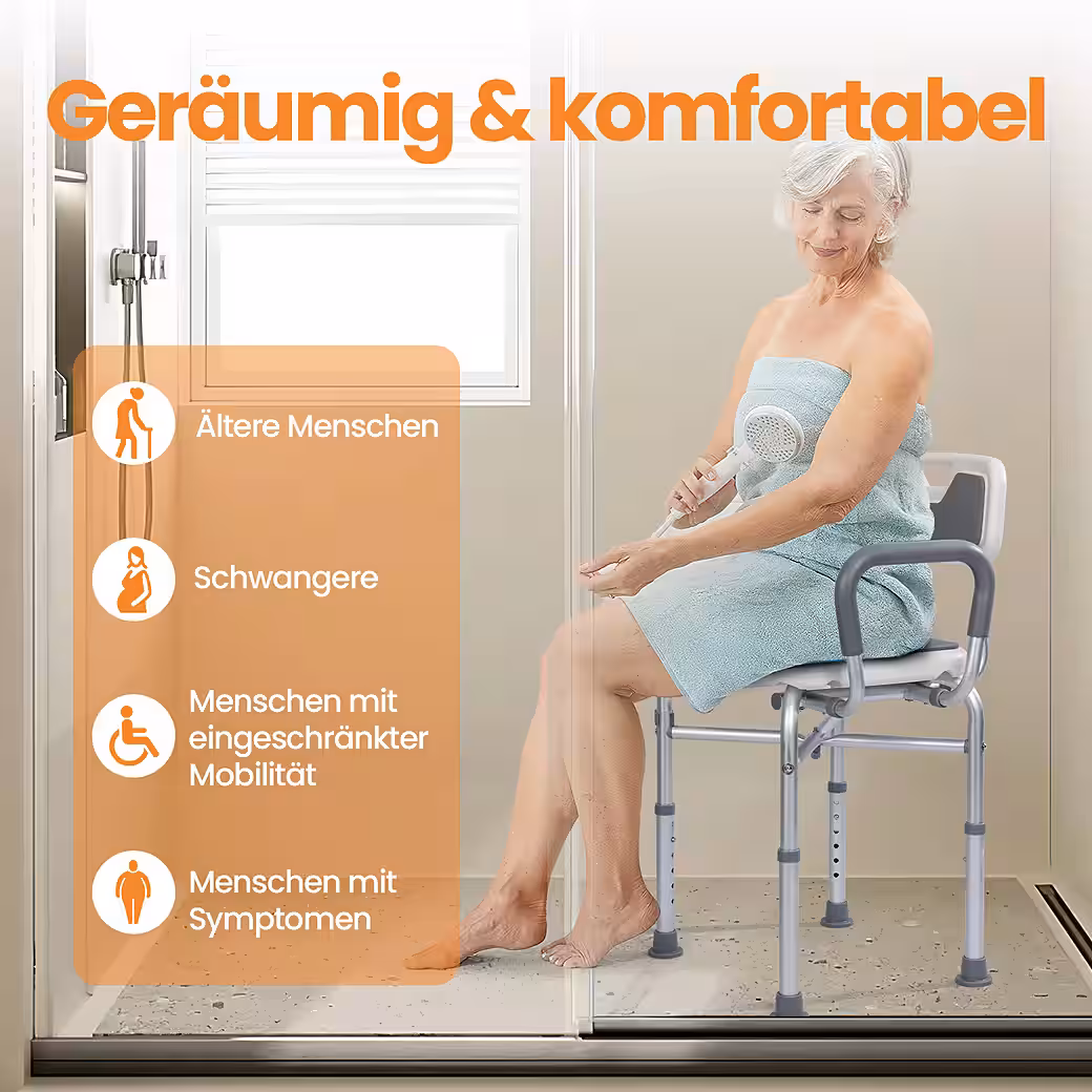 Enjoy greater safety and comfort in the shower! Our shower chair with armrests combines a thoughtful design with high-quality materials. This versatile shower stool/bath stool provides the perfect seating aid for seniors, people with limited mobility, or anyone who simply wants more security while showering. With six individual height settings and adjustable armrests, it adapts perfectly to you – for a safe and relaxing shower experience.
