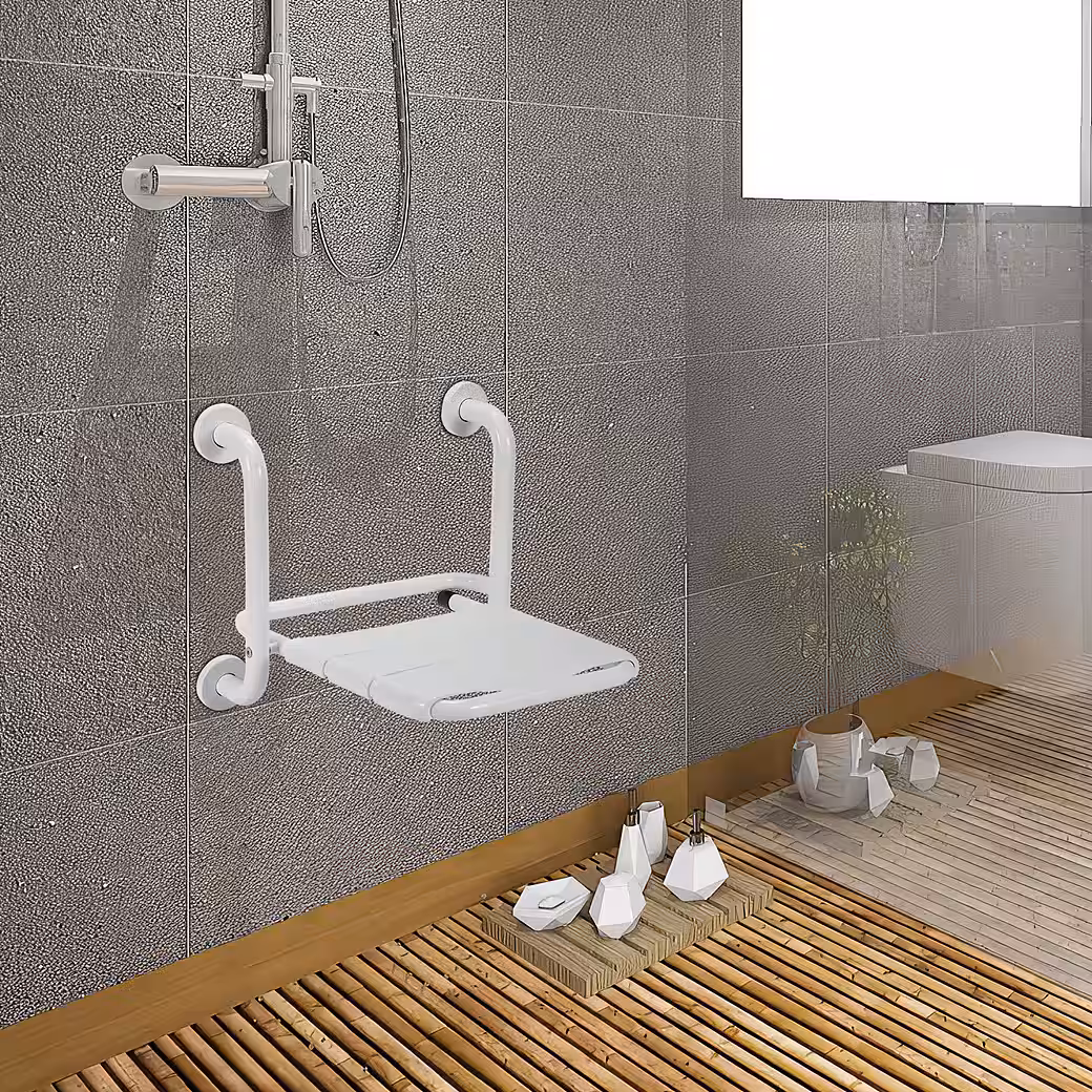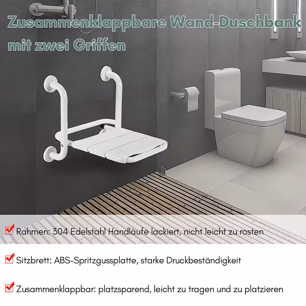 The seat surface of our shower seat models, whether a folding shower stool or a wall-mounted folding shower seat, is made of ABS die-cast plastic. This material withstands high pressure, is easy to clean, does not absorb water, and is slip- and impact-resistant. The handles are made of rust-resistant 304 stainless steel and feature a durable powder coating to prevent rust and fading.
