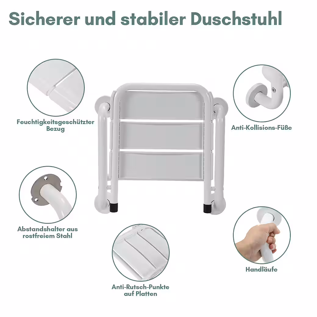 Our folding shower seats, including the folding shower stool and the wall-mounted folding shower seat, are equipped with side handrails and non-slip dots on the seat surface. This guarantees maximum safety and stability.