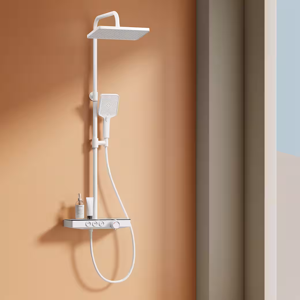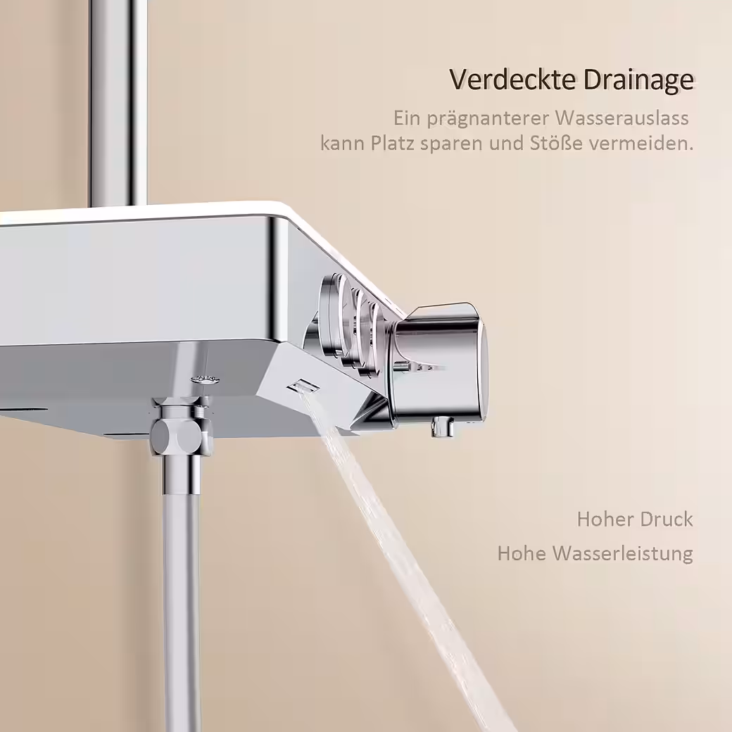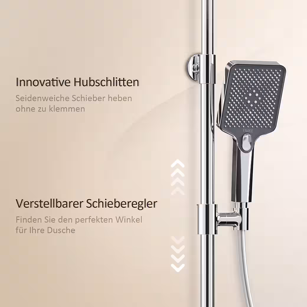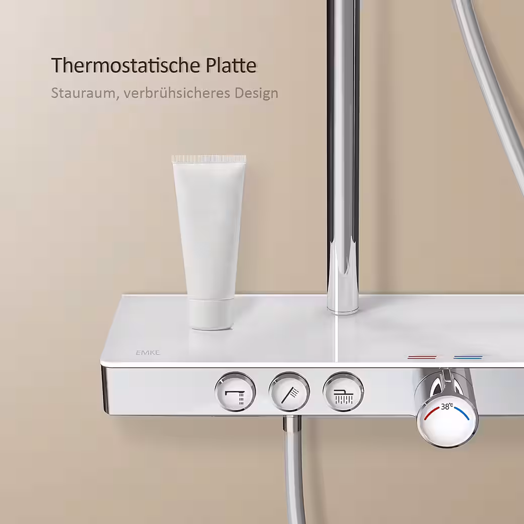 The EMKE shower system features a precision thermostatic valve with automatic sensor adjustment. Constant water temperature; no more repeated adjustments.