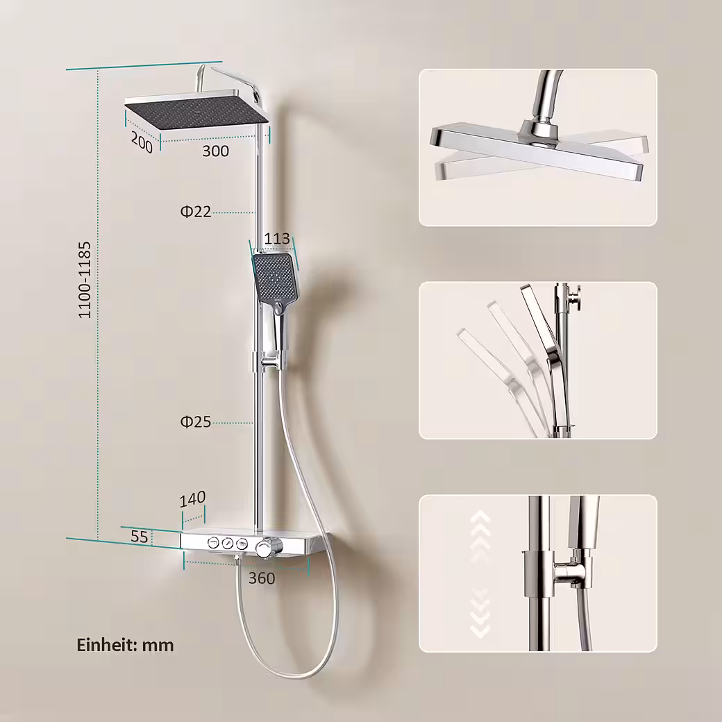 - Overhead shower – Material: 304 stainless steel; Size: 30x20cm