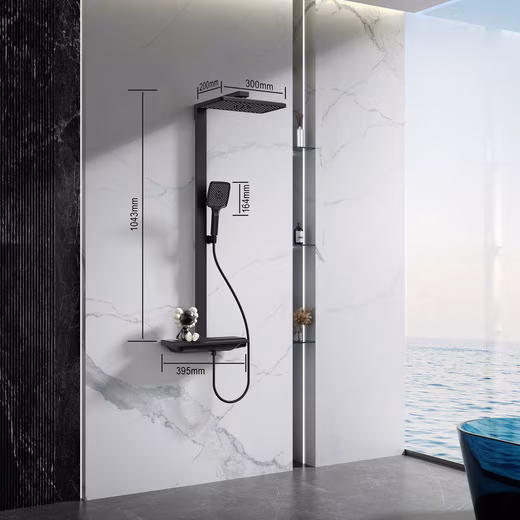 This stylish shower system combines elegant design and functionality: The robust aluminum construction with tempered glass offers ample storage space. The wide overhead shower head provides a soothing shower experience with a consistent water flow, while the kink-resistant PVC hose and easy-to-clean silicone nozzles simplify maintenance. The intuitive piano-button controls and high-quality details transform every shower into a luxurious experience.