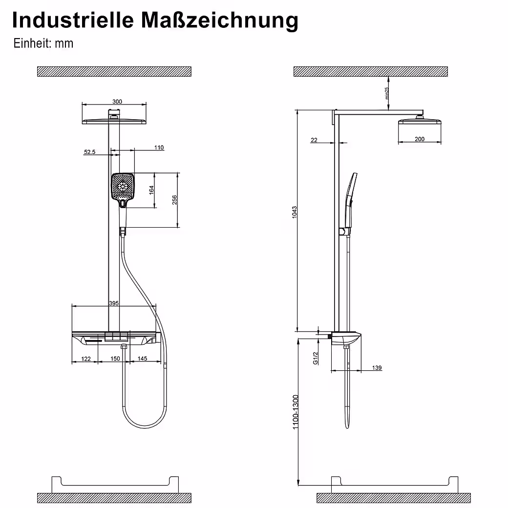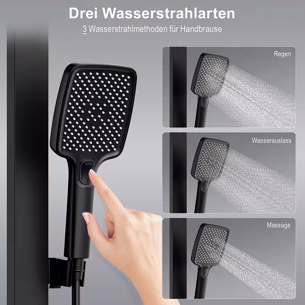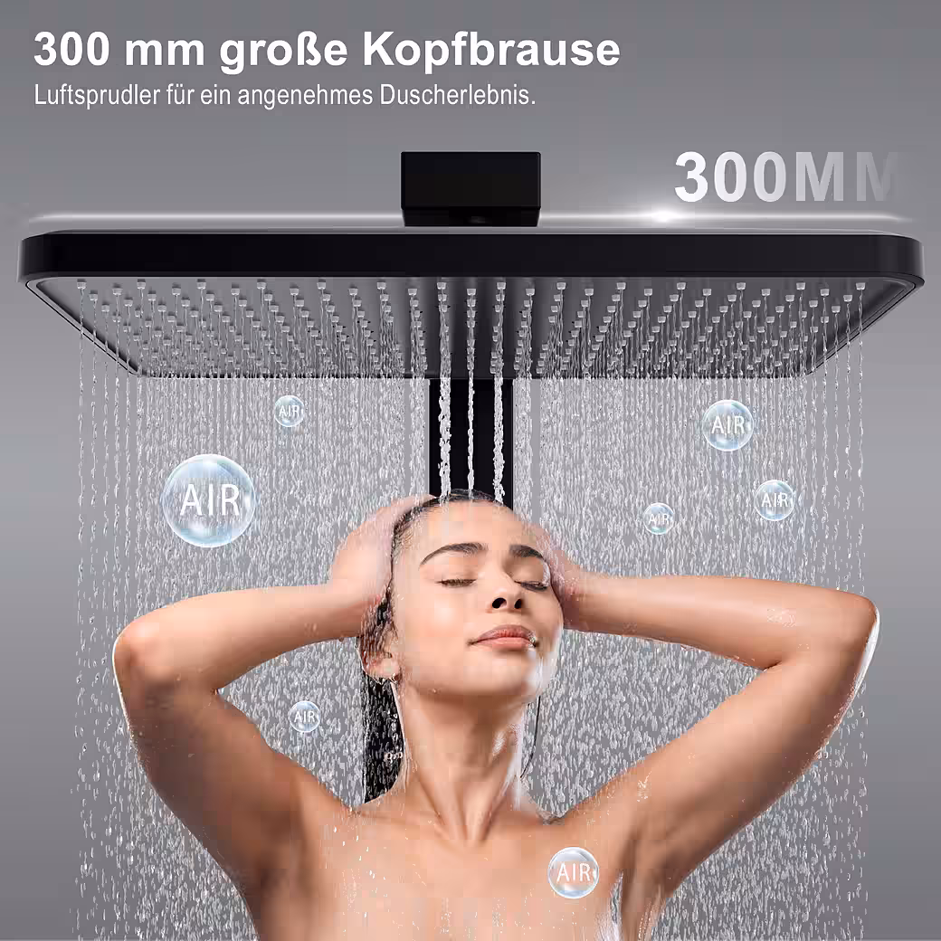 This stylish shower system combines elegant design and functionality: The robust aluminum construction with tempered glass offers ample storage space. The wide overhead shower head provides a soothing shower experience with a consistent water flow, while the kink-resistant PVC hose and easy-to-clean silicone nozzles simplify maintenance. The intuitive piano-button controls and high-quality details transform every shower into a luxurious experience.