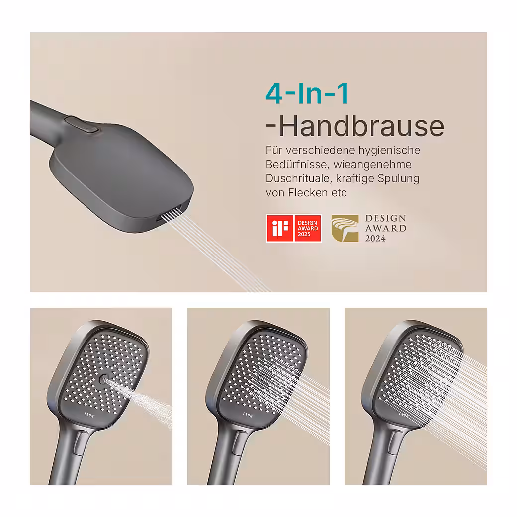 • 4 water jet types for versatile use: 360×240 mm rain shower head and hand shower with 4 modes (spray gun, jet spray, massage, spray) – ideal for cleaning & relaxation.