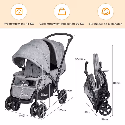 Our comfortable double stroller looks great and offers excellent visibility from the back seat. The 5-point safety harnesses feature soft shoulder pads. The stroller folds easily and can be used in any weather. The large shopping basket under the seat provides plenty of space for larger items like bags and jackets. It’s the perfect companion for everyday errands and travel.