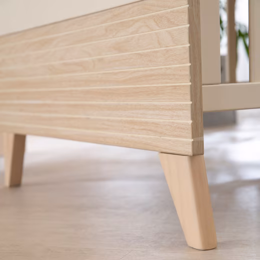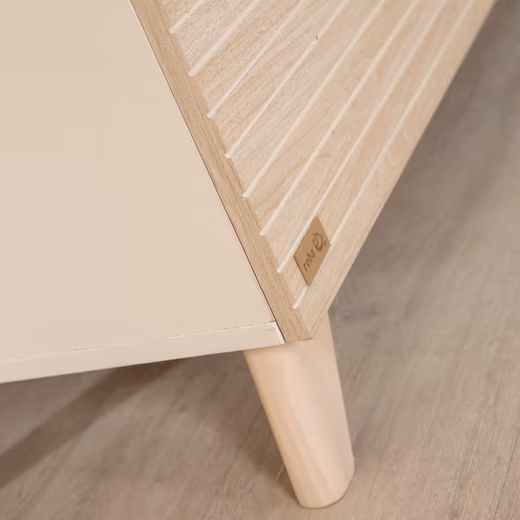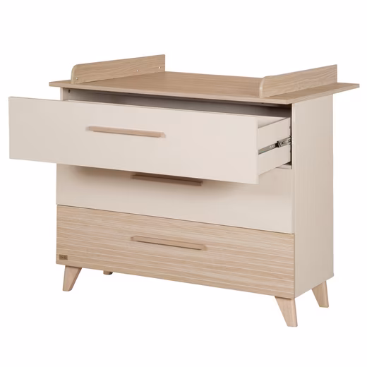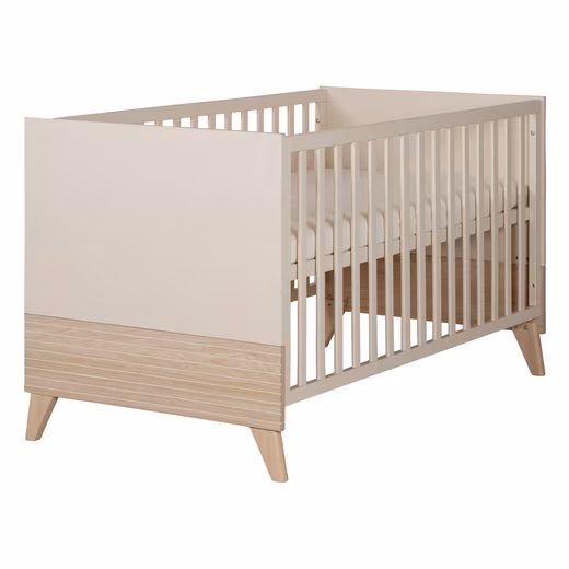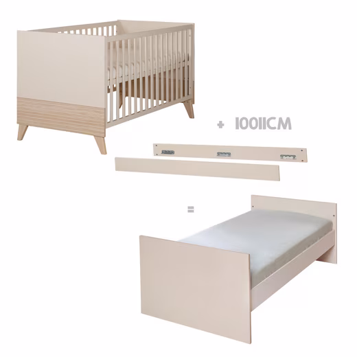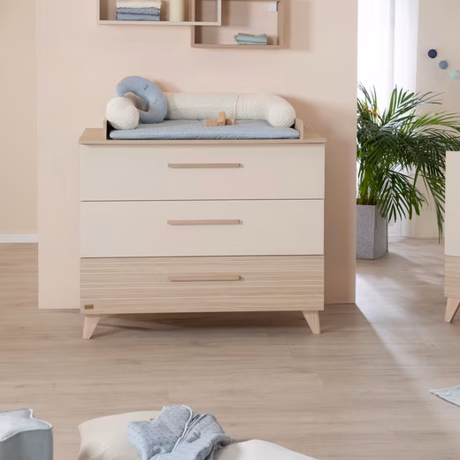The 2-piece ‘Sidney’ baby furniture set combines stylish design and practical functionality, offering the ideal solution for furnishing a modern nursery. It consists of a 70×140 cm convertible cot and a matching changing table, both in the elegant Cashmere color and featuring high-quality details in wood veneer and solid wood. The harmonious interplay of the simple, light-colored fronts with the shapely solid wood legs gives the furniture a warm and natural look, stylishly complemented by the high-quality milling in the oak veneer. The ‘Sidney’ convertible cot is a convertible piece of furniture that grows with your child, accompanying them from birth until age 7. With dimensions of 82 cm high x 143 cm wide x 76 cm deep and a 3-position adjustable mattress base, the cot offers back-friendly handling for parents and a safe sleeping environment for babies and toddlers. Three removable bars make it easier for older children to get in and out independently, while separately available conversion sides (item no. 10011CM) quickly transform the bed into a junior bed. Manufactured according to current European safety standards, this convertible crib offers maximum safety, stability, and durability. Complemented with a suitable mattress or a 4-piece roba children’s bedding set, the bed becomes a cozy sleeping space for your child. The ‘Sidney’ changing unit completes the set with its practical functionality and modern design. With a comfortable changing height of 90.5 cm, it makes baby care comfortable and back-friendly for parents. The three fully extendable drawers offer ample storage space for diapers, care products, and clothing, keeping everything within easy reach. Once your child is out of diapers, the changing unit can be easily removed, allowing the dresser to continue to be used as a stylish piece of furniture. Its ergonomic dimensions of H 98 x W 110 x D 75/40 cm (with/without changing unit) make it a space-saving and versatile piece of furniture that can be combined with other furniture from the ‘Sidney’ room series. Thanks to the skin-friendly and pollutant-tested materials, as well as manufacturing according to European safety standards, the changing table offers not only maximum safety but also sustainability and compatibility. The ‘Sidney’ baby furniture set combines thoughtful design, high-quality materials, and practical functionality to create a harmonious and safe environment for your child. It is the perfect choice for parents who value modern and sustainable furnishings that grow with their child’s needs.